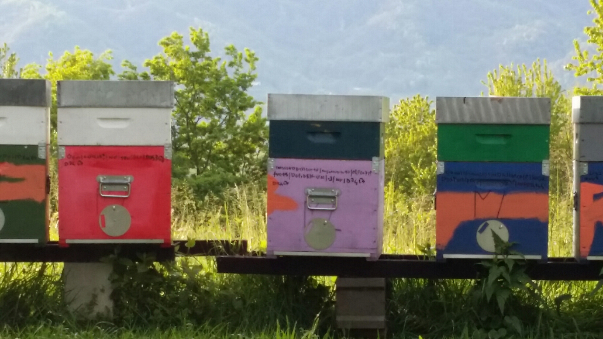 I had a freezing cold swim and went for a brisk walk up to a field where there are boxes of brightly coloured beehives overlooking the mountains: