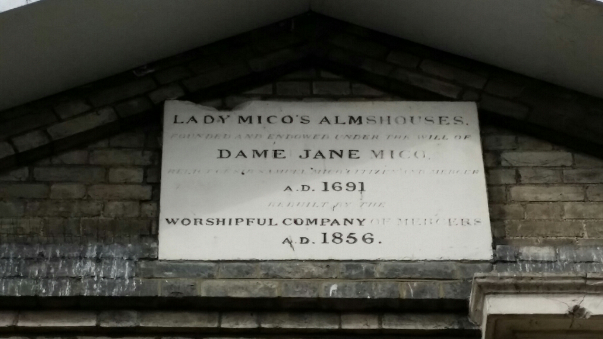 Who she ? Her husband, Sir Samuel Mico, grew rich on the profits of the Levant Company and East India Company, importing silks. He also (surprisingly since he was a pure Londoner) owned the George Inn in Weymouth. When he died in 1665, he split his estate between his widow Jane, his nephew Samuel, the Mercer’s Company, and the town of Weymouth, which celebrates his memory every year with lemonade and hot cross buns. She in turn drew up her will in 1670, leaving money to multitudes of relations, for ‘the redemption of Christian slaves in Barbary’, as well as for 10 poor widows of the city of London who were to be housed in her Almshouses. They remained there until 1976 when they were moved to new accommodation in Whitehorse Lane. She left funds to her nephew which he could not claim because he failed to marry one of his cousins as specified. The funds accrued until they enabled the establishment of a teacher training college in Jamaica.