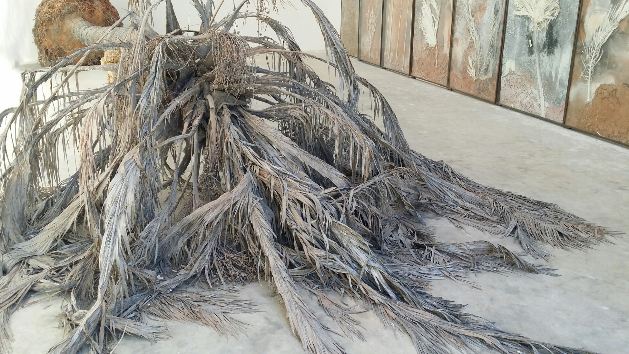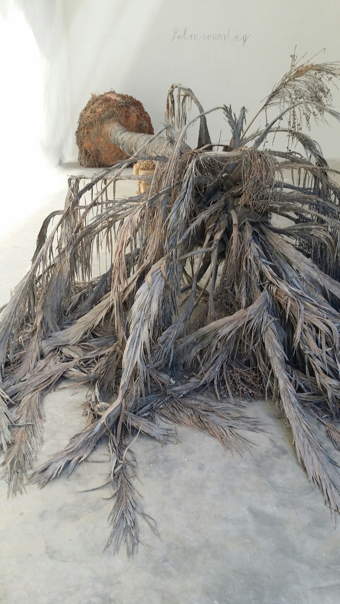We walked down the hill where there are makeshift chapels, like stations of the cross, each one containing a single work of art. A palm tree: