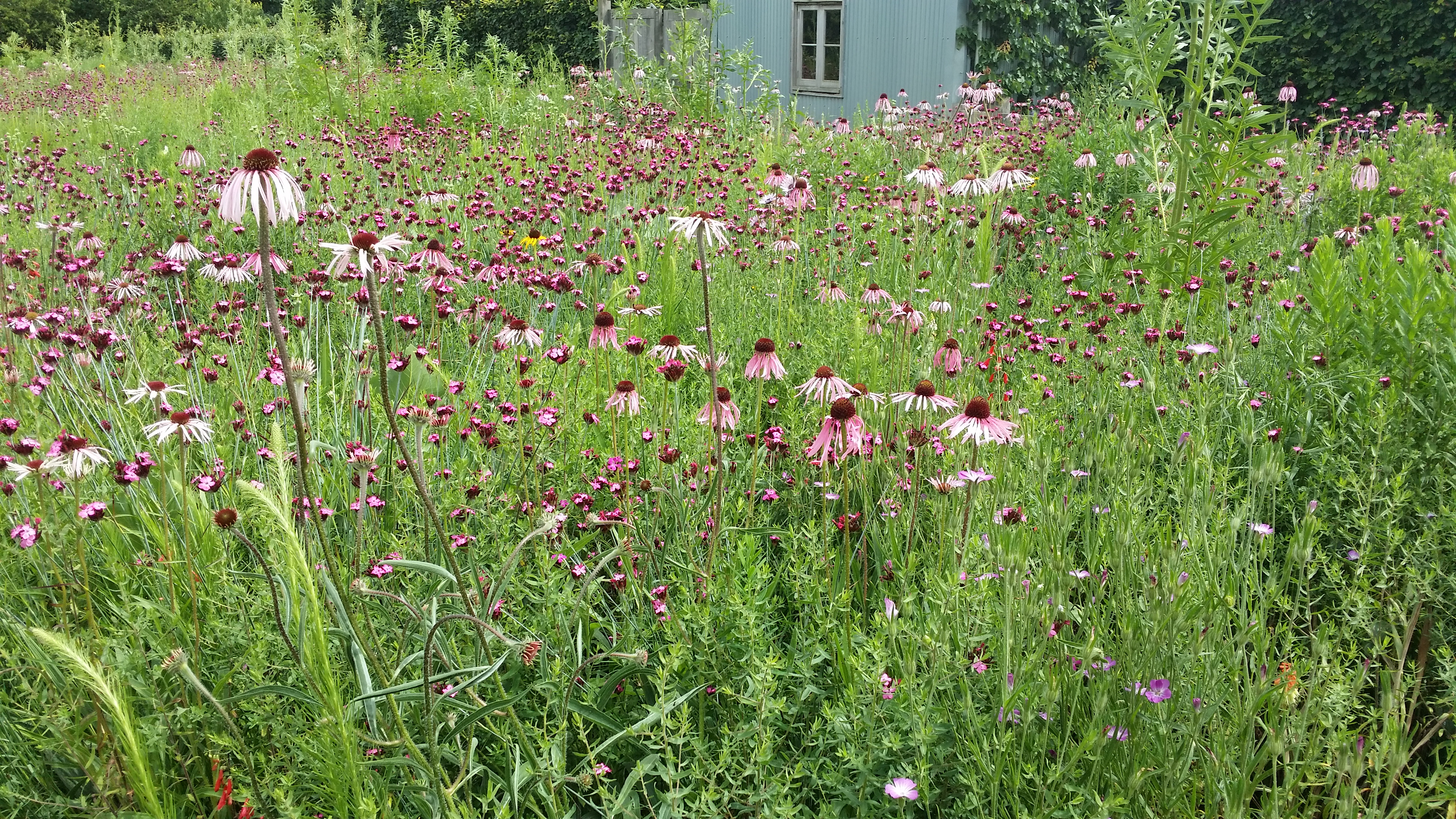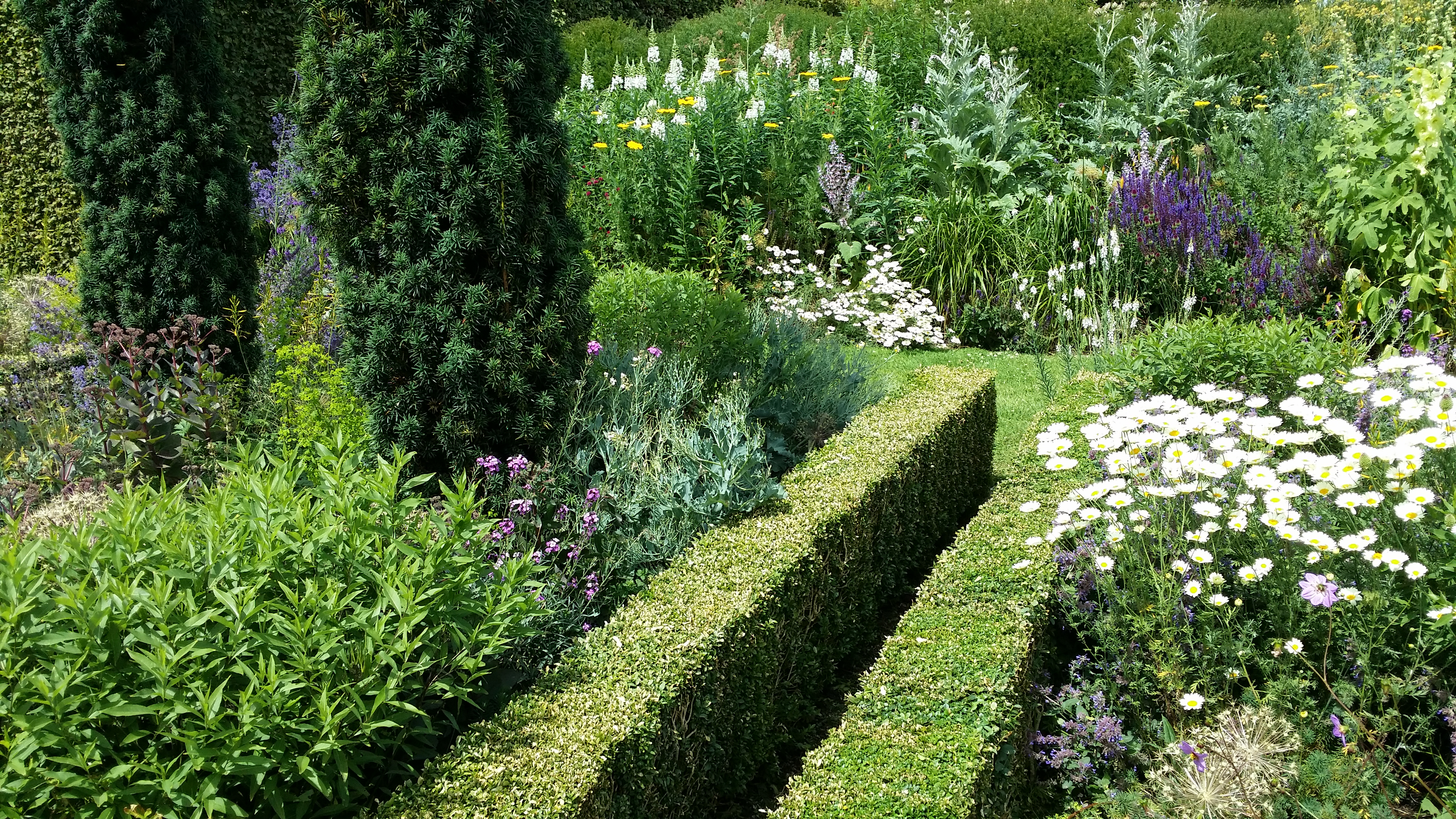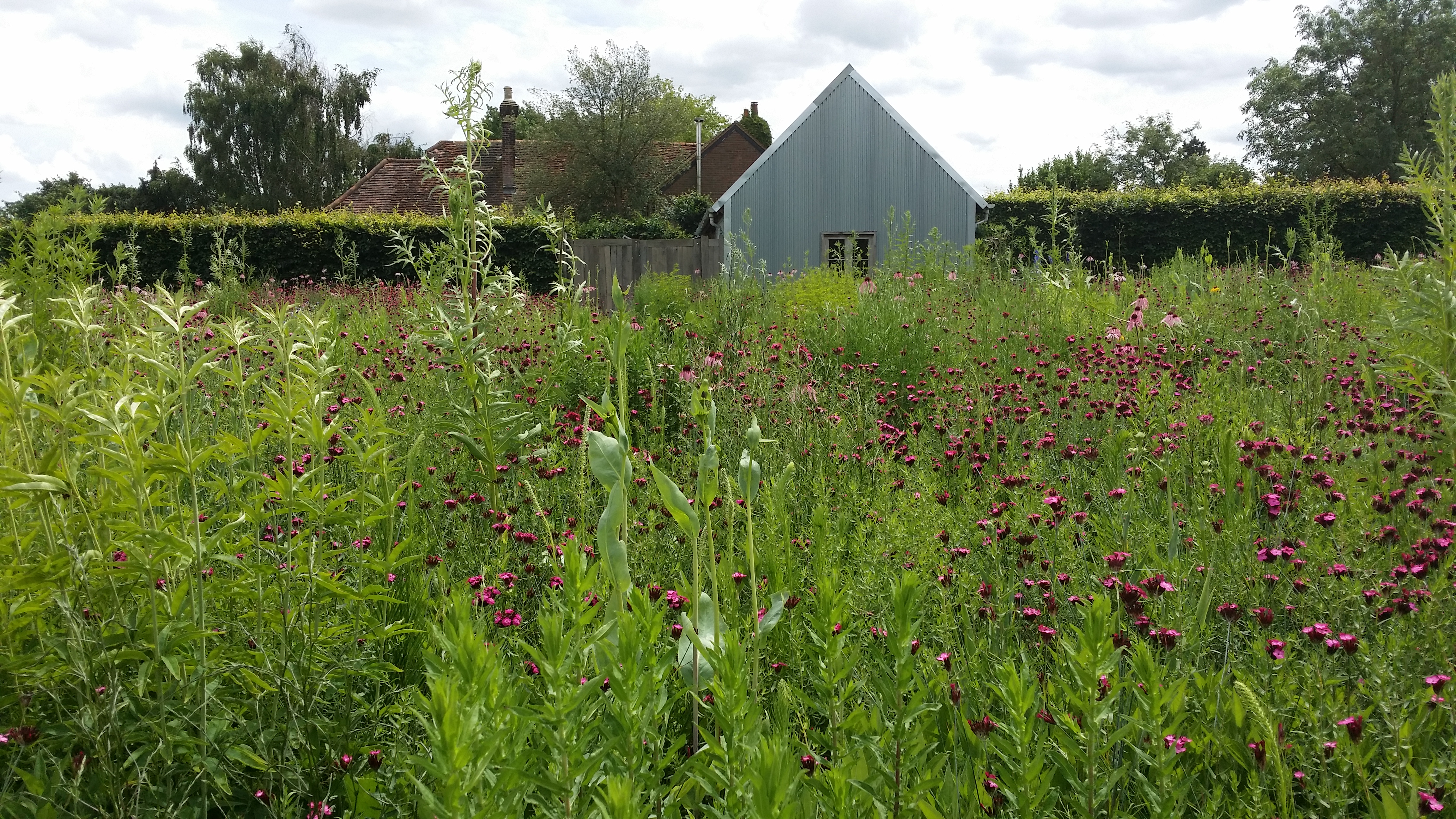 We were invited to lunch by the Stuart-Smiths to see the wonderful garden they have made in a strange bit of countryside sandwiched between the M1 and Hemel Hempstead: part semi-formal garden, part wilderness, with banks of high flowers in beds, a meadow planted with north American prairie plants and an immaculate vegetable garden. This is the semi-formal garden: