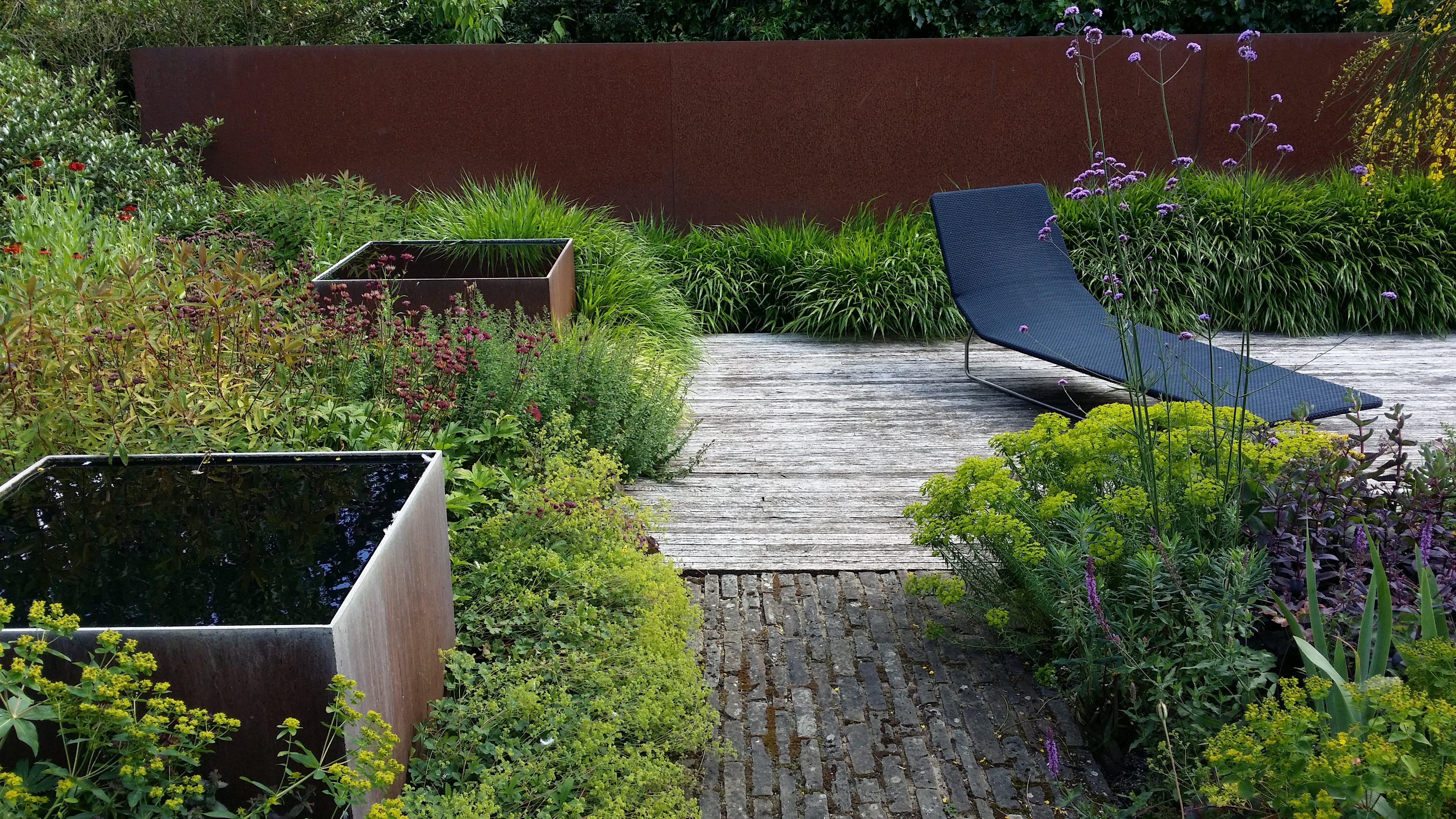 This is the sunken courtyard garden with steel tanks and a Corten wall: