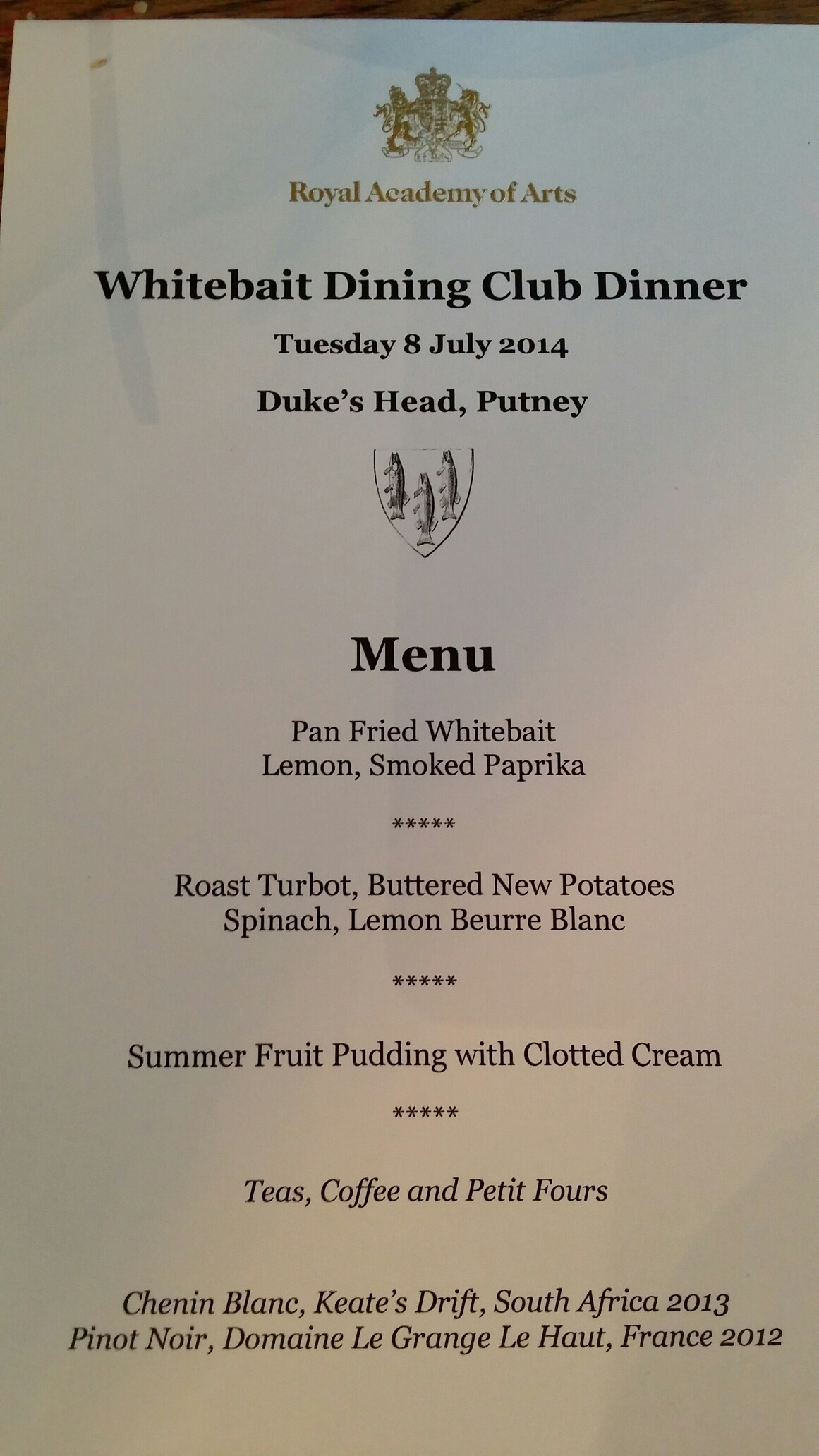 The RA has traditionally celebrated summer with a whitebait Dinner when a large group of RAs and their guests board a boat at Westminster Pier and go either downriver to Greenwich, as Turner did, or more often upriver to Putney, Barnes or Mortlake. Farington describes an occasion in 1818 when a party of RAs visited Eel Pye House in Twickenham and then ‘a little after 3 oClock and about 4 we sat down to excellent fare brought from the Freemason Tavern under the management of a Clever Waiter. We dined in the open at at one table and removed to another to drink wine and eat fruit’. This year, a boat load of 80, more than ever before, went to the Duke’s Head tavern in Putney, an old boating inn, where, as is traditional, we consumed highly salted whitebait and white wine:
