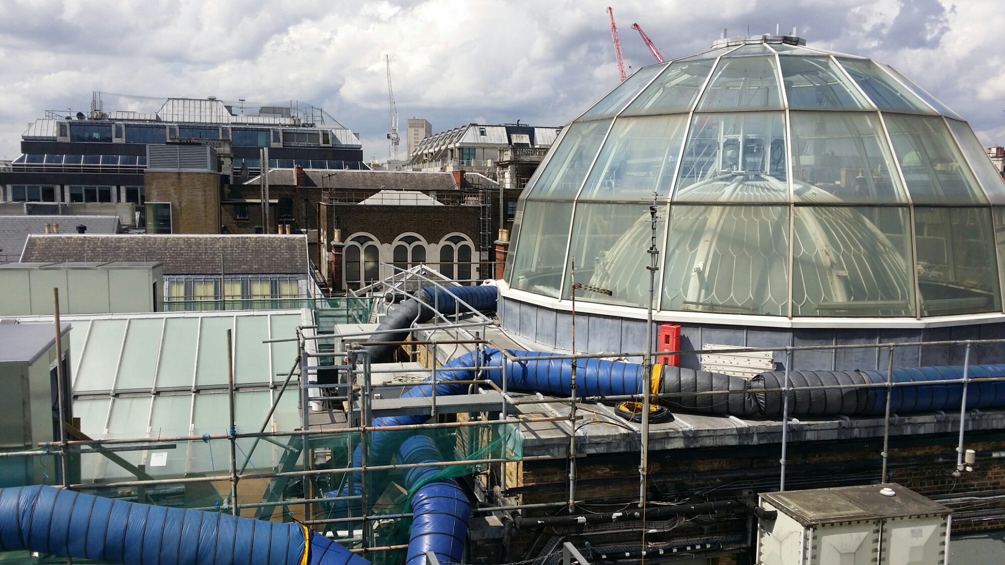 I arranged to take some patrons up onto the roof of Burlington House this evening in order to show them the scale of the site and the significance of our plan to connect Burlington House to the old Museum of Mankind building in Burlington Gardens. It was originally all one site, with a courtyard in front of a mansion built in the 1660s, transformed in the early eighteenth-century by Lord Burlington and sold to the government by the Duke of Devonshire in 1854. Richard Carew-Pole who is leading our fund-raising says the site as a whole is the same size as the British Museum. Oddly, I had scarcely been onto the roof before last week: