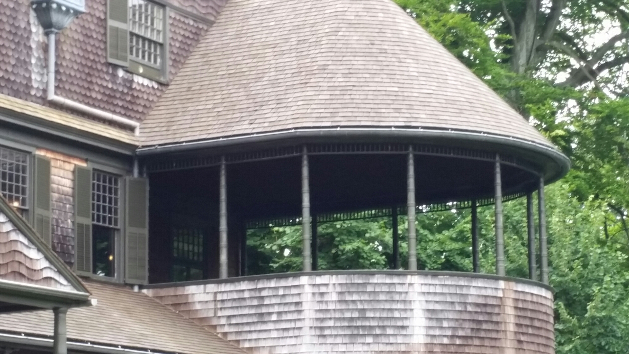 I had forgotten the relentless opulence of Bellevue Avenue in Newport, Rhode Island, the so-called ‘cottages’ towering over the street. We drove through the drizzle admiring their oppressive grandeur, many of them still private residences. The question was, which to visit ? The Breakers or the Marble House ? We chose the Isaac Bell Jr House by McKim, Mead and White, built in the early 1880s, just after they had designed the Casino nearer the centre of town. It’s in a wonderful, over-elaborate Arts-and-Crafts style with rich shingled exterior, a bulbous roof based on a French windmill and an interior stripped of most of its furniture, but with elaborate decorative details drawn from historic French interiors, mantelpieces based on designs by E.W. Godwin, a big inglenook, and silk and rattan in the ceilings.