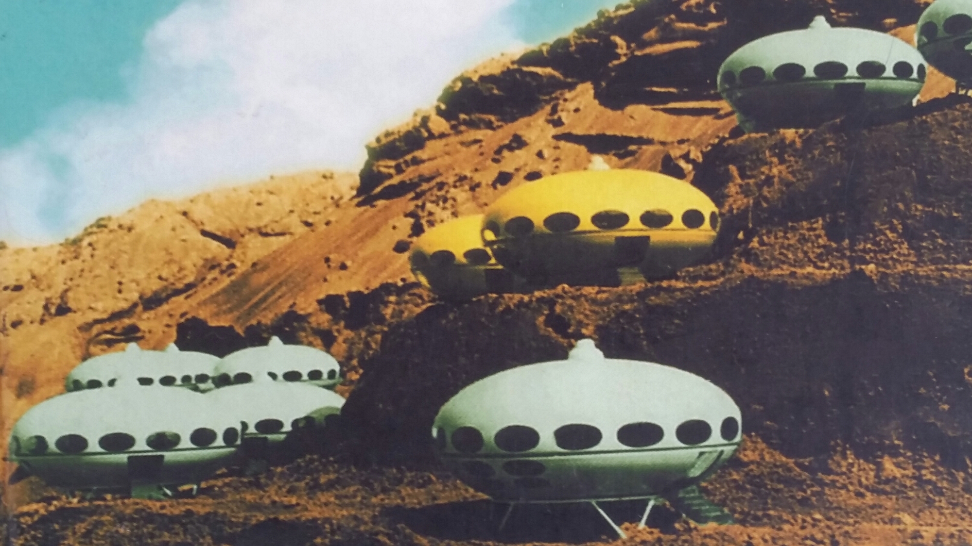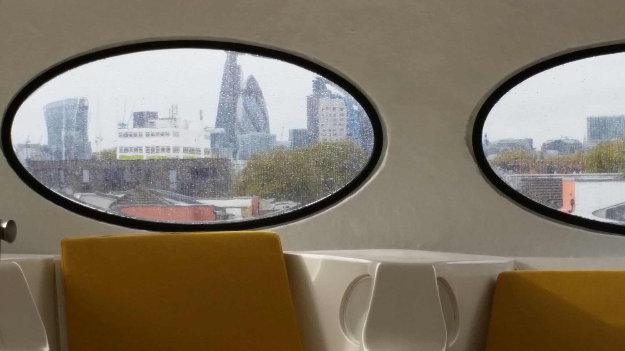 We went on a little excursion this morning to see the Futuro House which looks as if it’s landed like an alien spacecraft on the roof of Matt’s Gallery next door to the Ragged School Museum on the Regent’s Canal. The first Futuro House was designed in the 1960s in Finland as a ski cabin and they were then manufactured as cheap homes. But they were so unpopular that they were subjected to drive-by shootings in the United States. This one was found ruined in South Africa and has been meticulously restored by Craig Barnes, an architect, maybe as an example of cheap manufactured homes: