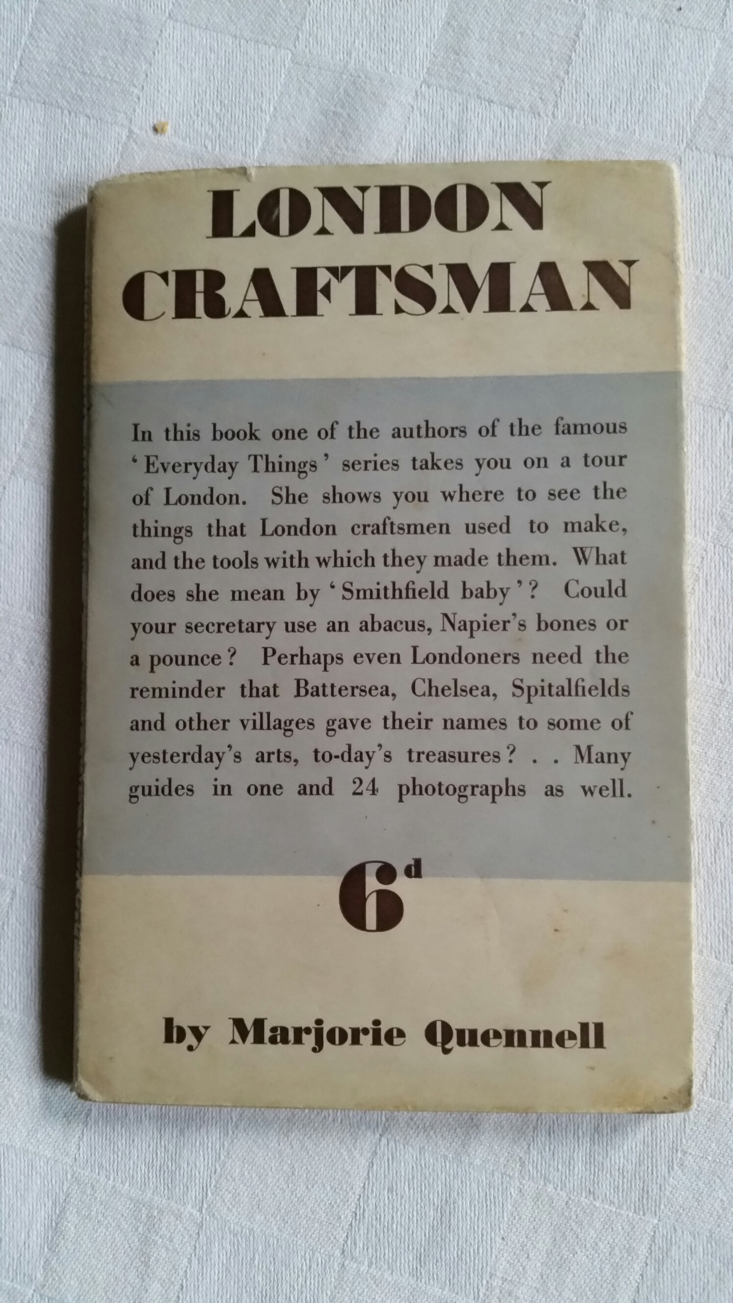 Yesterday was my least favourite day of the year when, as an annual ritual, I try to tidy my study. But there are occasional rewards, including this year the re-emergence of a small book which my brother kindly gave me – I think for Christmas – entitled London Craftsman: A Guide to Museums having Relics of Old Trades, published in 1939 by London Transport priced at 6d. Marjorie Quennell was co-author with her husband Charles of the four-volume A History of Everyday Things which pioneered the study of ordinary domestic objects and, in 1935, the year of her husband’s death, she was appointed as the first curator of the Geffrye Museum (she lived on after the war until 1972). Her book was advertised as ‘a tour of London’ in which ‘She shows you where to see the things that London craftsmen used to make, and the tools with which they made them’. The museums include the London Museum, then housed in Lancaster House (and had a 6d. entrance fee mid-week), the Horniman Museum, which had a section of bygones, and the Bethnal Green Museum, which was described as ‘very popular’ and had a special display of Spitalfields silk.