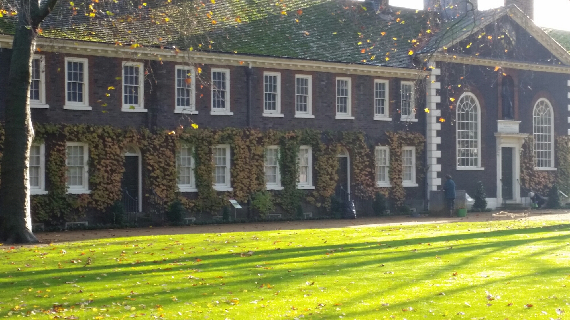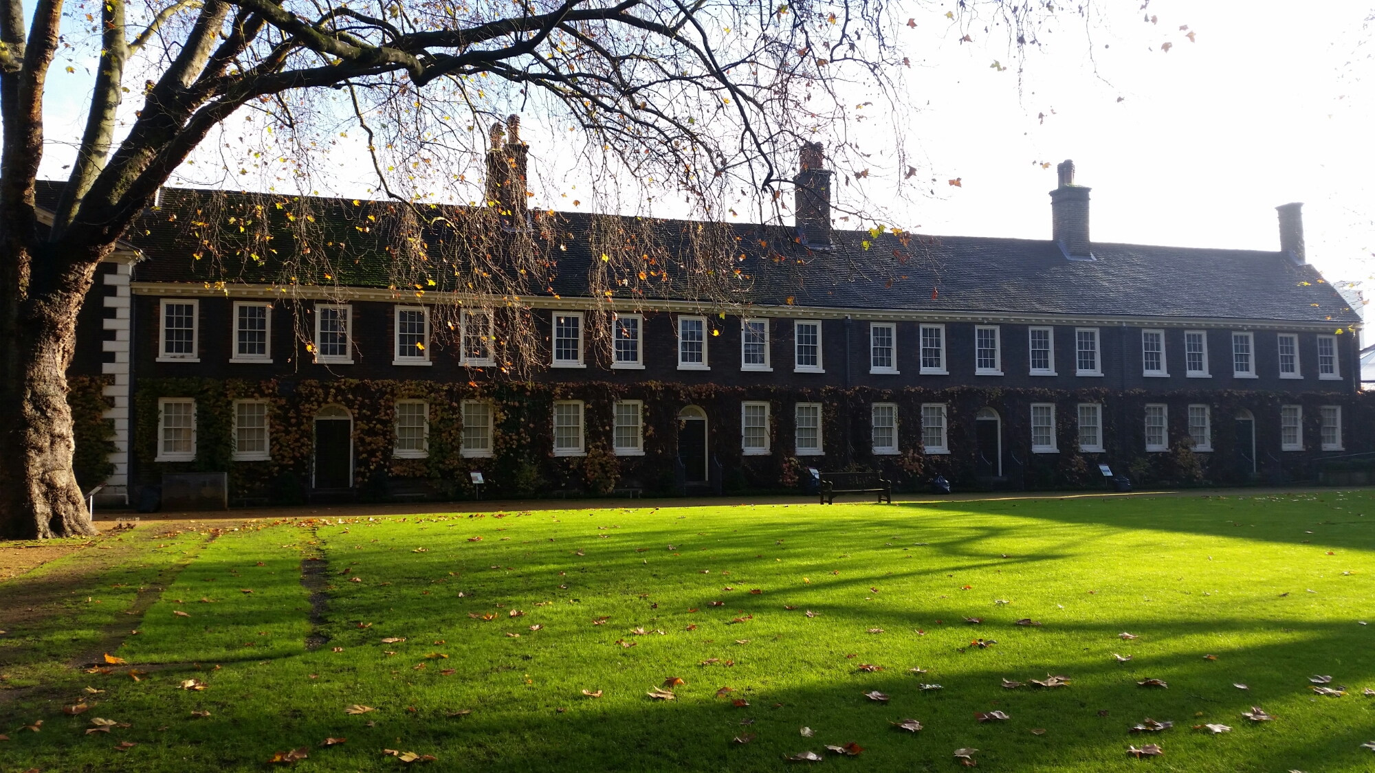 One of the pleasures of today was walking past the Geffrye Museum and seeing how the crisp November sun lit up the space in front of the early eighteenth-century almshouses. They were built out of a bequest from Sir Robert Geffrye, a big wheel in the Ironmonger’s Company, Lord Mayor in 1674 and died in 1703, leaving the residue of his estate to be used to construct fourteen almshouses, with a chapel in the middle and a statue commemorating the founder: