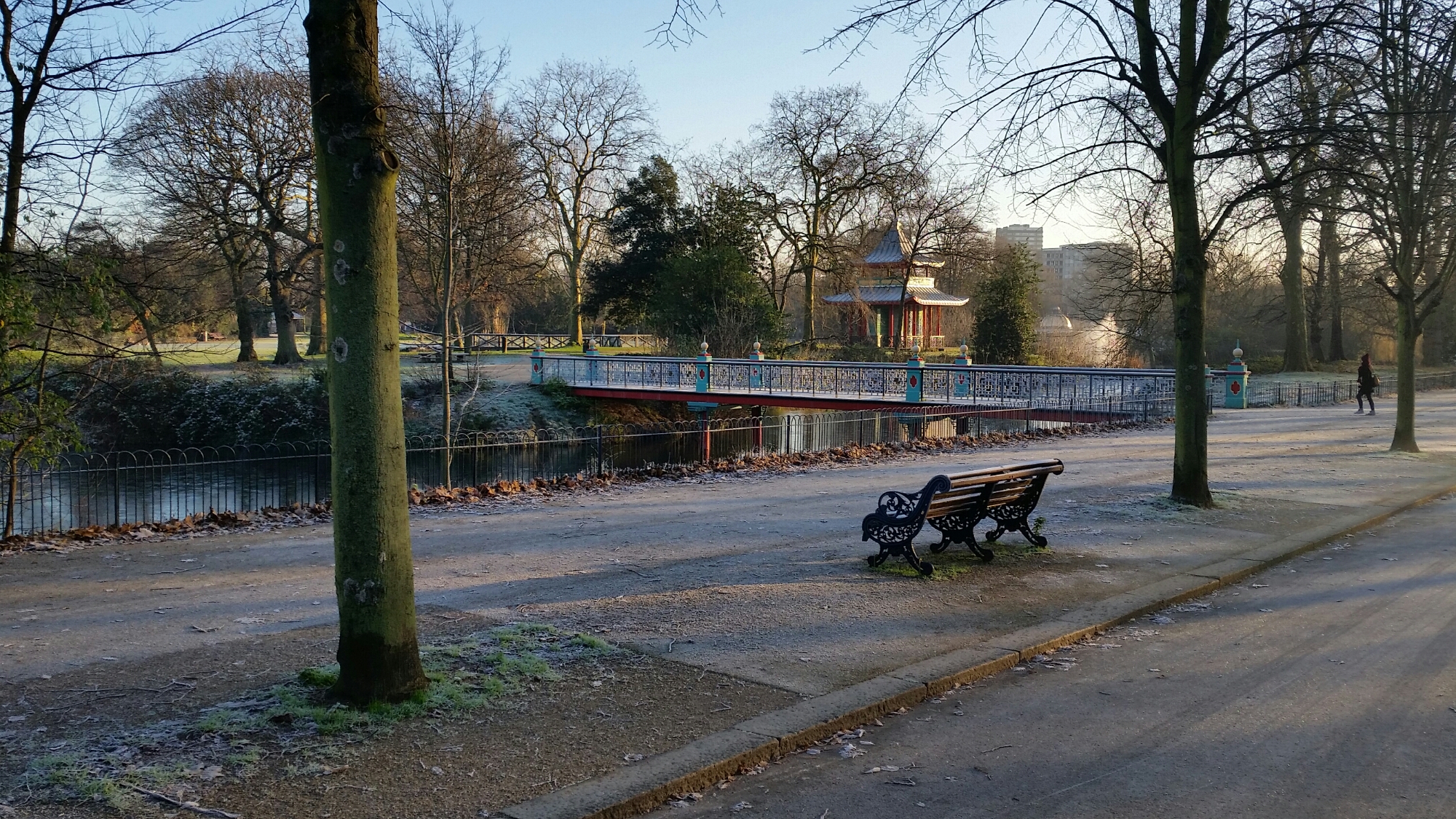 The pagoda in Victoria Park was originally designed for a Chinese exhibition in Hyde Park in 1842, was moved to the newly laid out Victoria Park in 1847, had a bridge designed for it by James Pennethorne, decayed in the war, was demolished in the 1950s, and only recreated recently in the renovations funded by the HLF:-