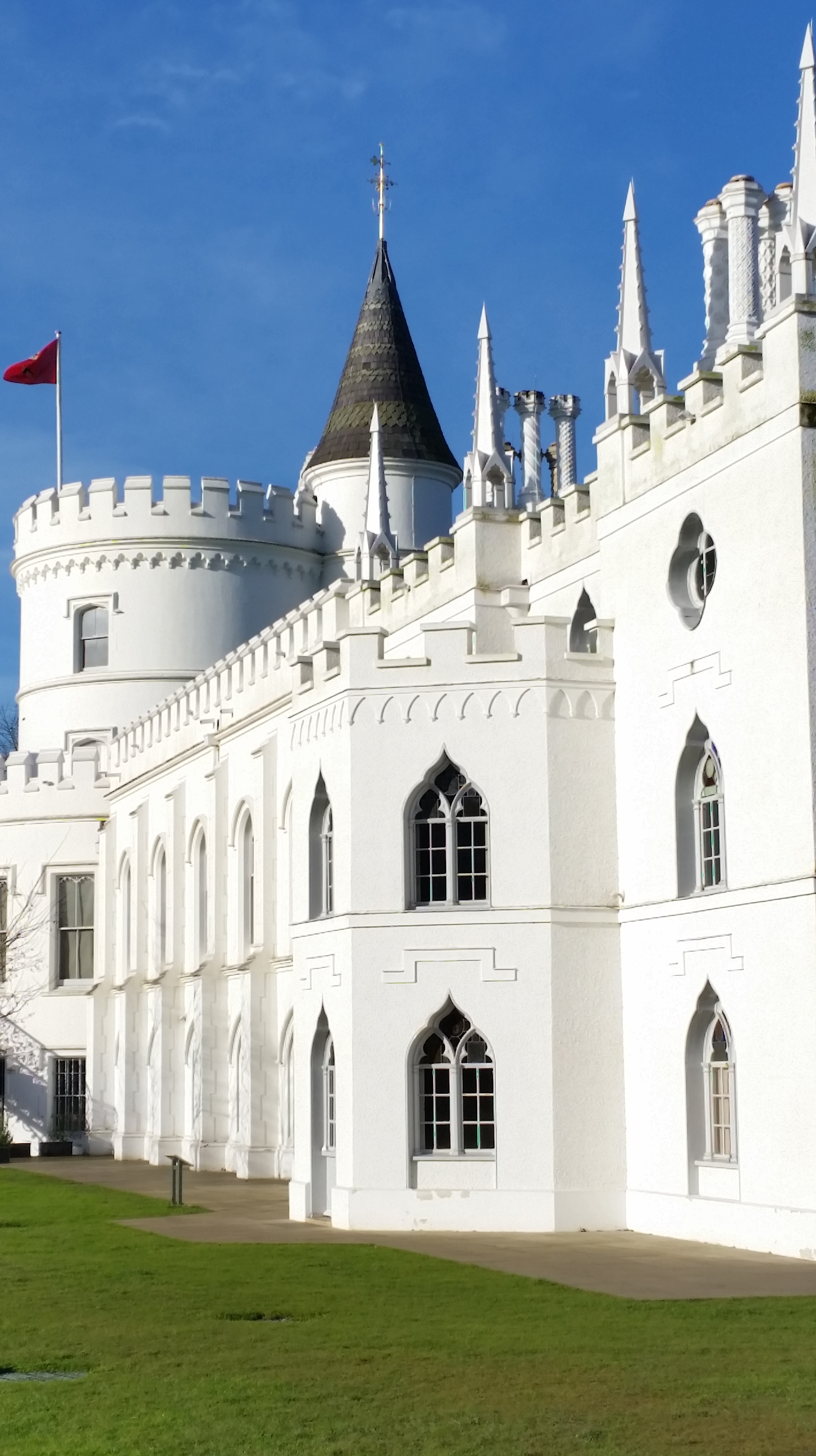 I had arranged to come out early to Strawberry Hill, Horace Walpole’s suburban retreat by the Thames in Twickenham, which he bought in 1747 from Mrs. Chenevix, the toy seller, and gradually added to and gothicised during the course of his life with the help of his friend, John Chute, whom he had met on the Grand Tour. The building history is immensely complicated, beginning with a small house of the 1690s which was redecorated, stained glass inserted in the windows and flock wallpaper by Thomas Bromwich, some of which survives in a cupboard. In 1753, a grand gothic library was added, based on Chute’s drawings of Old St. Paul’s, together with a gothic staircase, designed by Richard Bentley, son of the classical scholar. Then, Walpole’s ideas got grander and he added a gallery, based on Henry VII’s chapel in Westminster Abbey, and the Tribune, which was his cabinet of curiosities. It’s a fascinating combination of collecting, antiquarianism and slightly more playful ancestor worship.