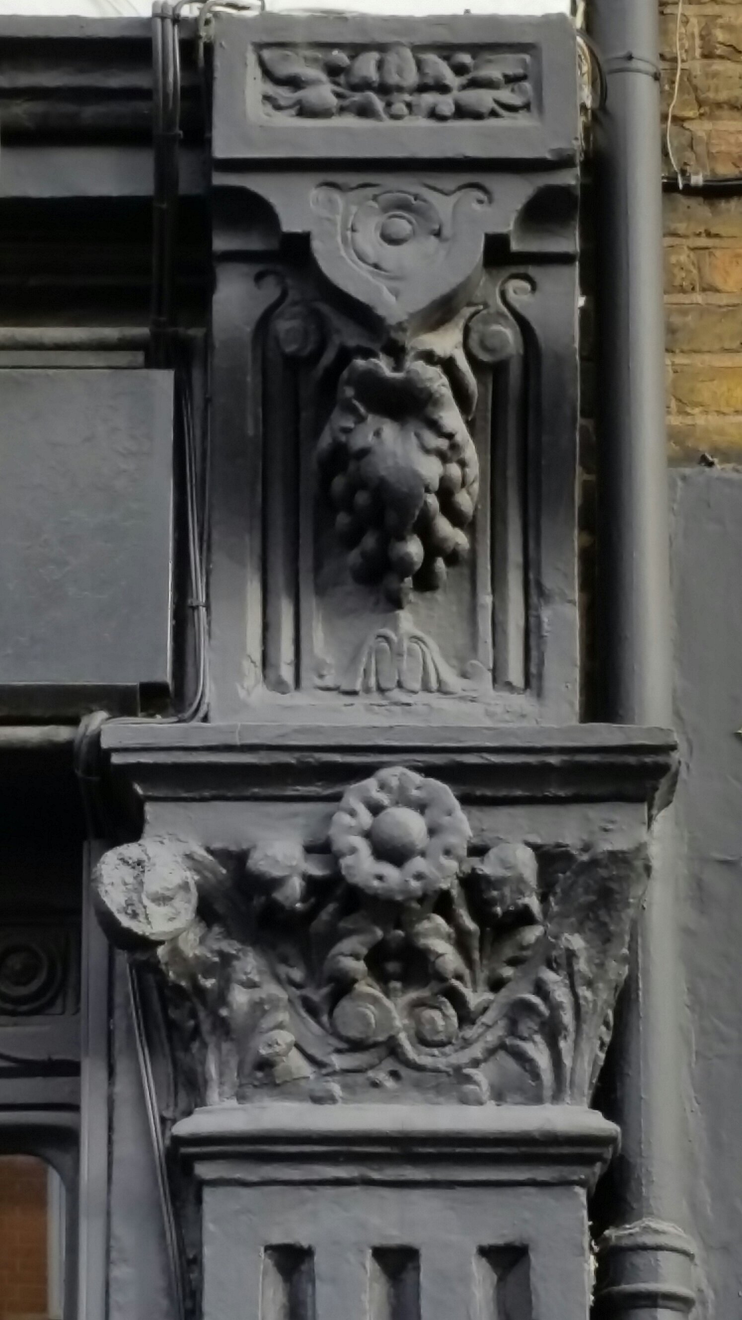 We also liked the rather crude columns and bunches of grapes on the Cooper’s Arms in Flood Street itself: