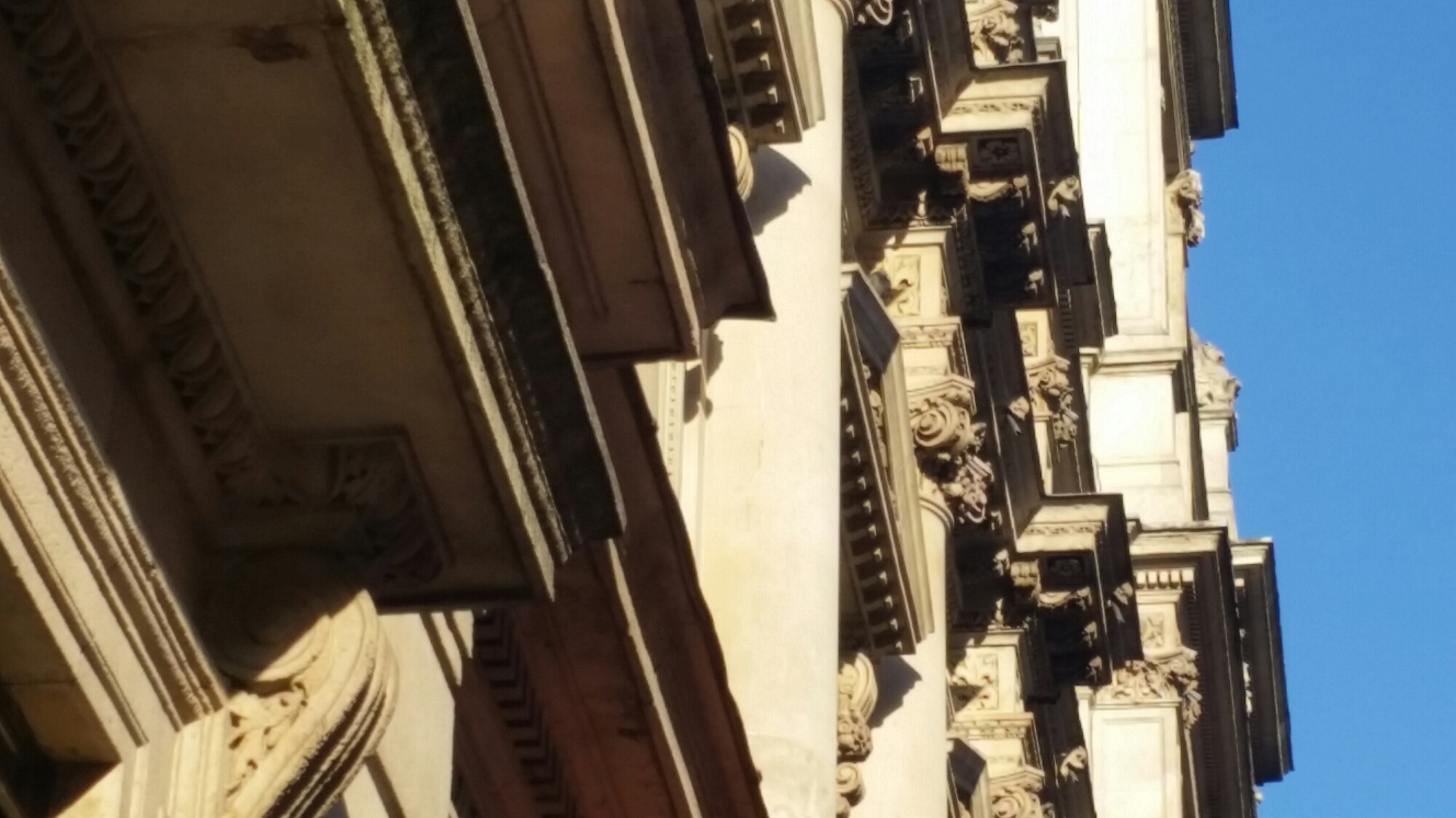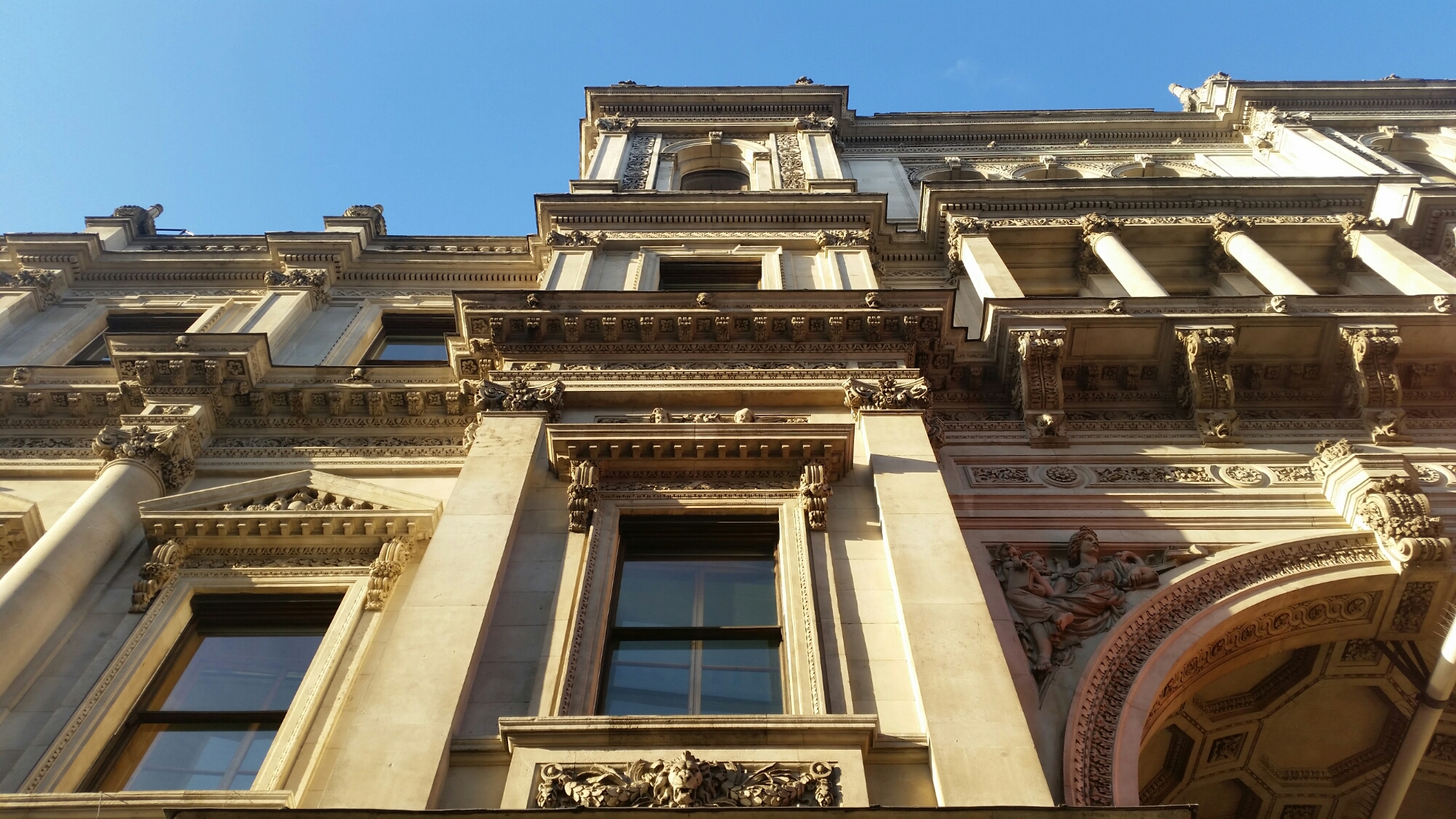I don’t normally pay much attention to the architecture of the great portico leading into the Royal Academy courtyard, but – in the fierce winter sun – I realised how fine some of the decorative detailing is.   The façade was designed by Robert Richardson Banks and Charles Barry Jnr., in March 1867, but it’s not clear who was responsible for the sculpture.   Someone must know.