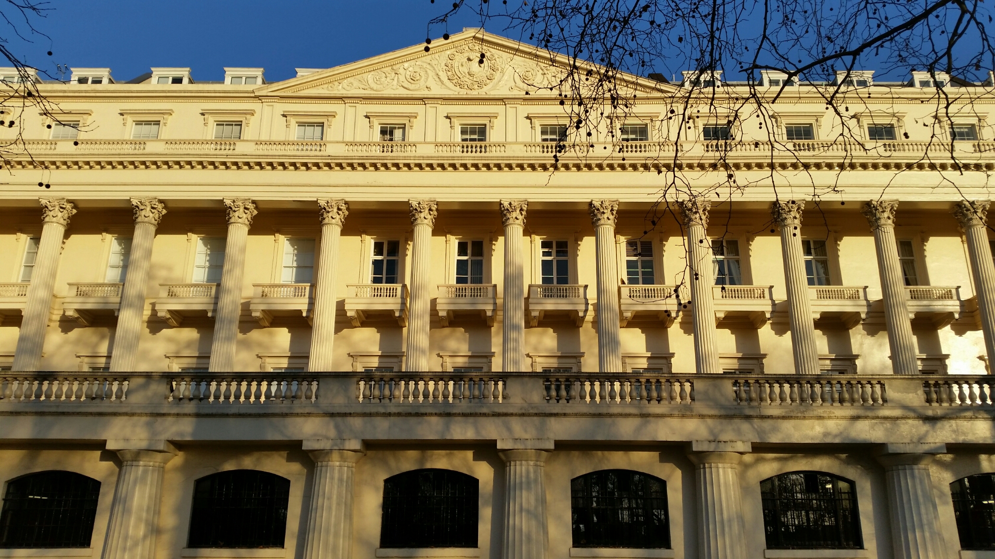 I have always found it odd that by far the grandest buildings on the Mall are not the two royal palaces, but the two grand façades of Carlton House Terrace, flanking the Duke of York Steps. Was it the memory of Carlton House itself which made John Nash think and compose on such an epic scale ? Or was it that it marked the end point of his urban composition which stretched from his great Terraces round Regent’s Park down Regent Street to Waterloo Place, the Athenaeum, and then Carlton House Terrace anchoring the composition alongside St. James’s Park ? Either way, it is more St. Petersburg than London:-