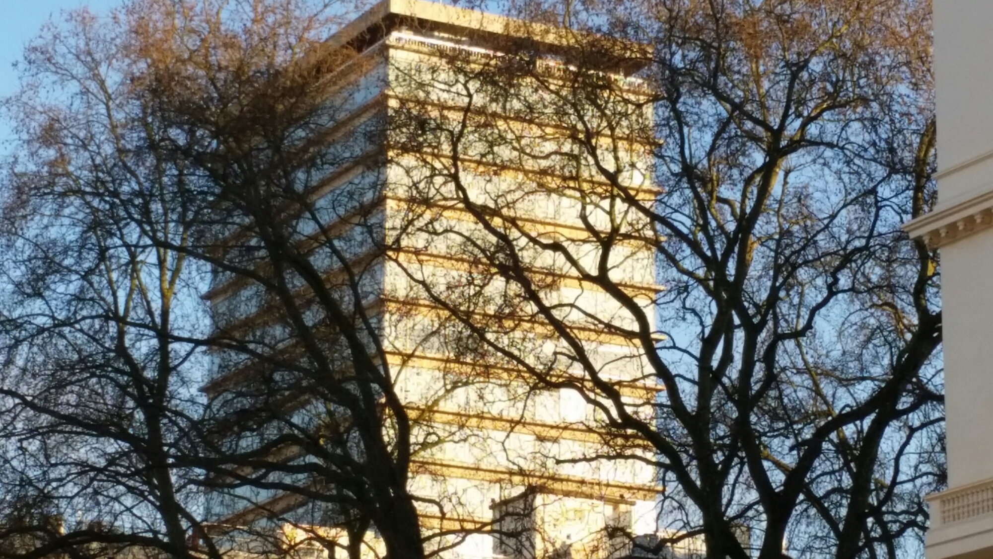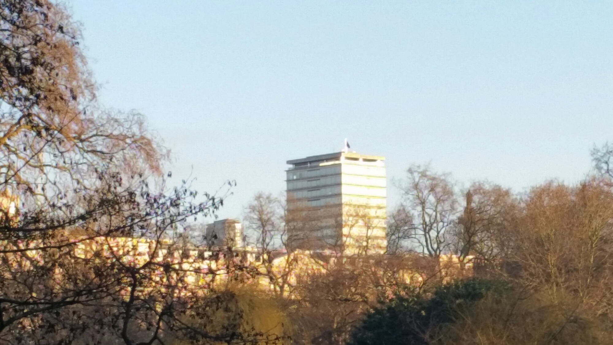 I have been meaning to take a photograph of New Zealand House gleaming across the lake in St. James’s Park and this morning I remembered. It looks like a rather alien spaceship hiding behind Carlton House Terrace, as indeed it was when it landed in central London in the early 1960s. I remember being bemused that Ian Nairn was so enthusiastic about it – ‘full of small virtues, of the accommodating kind for which one will willingly forgo a grand gesture’. But, unlike Nairn, I have never seen the view from the roof:-