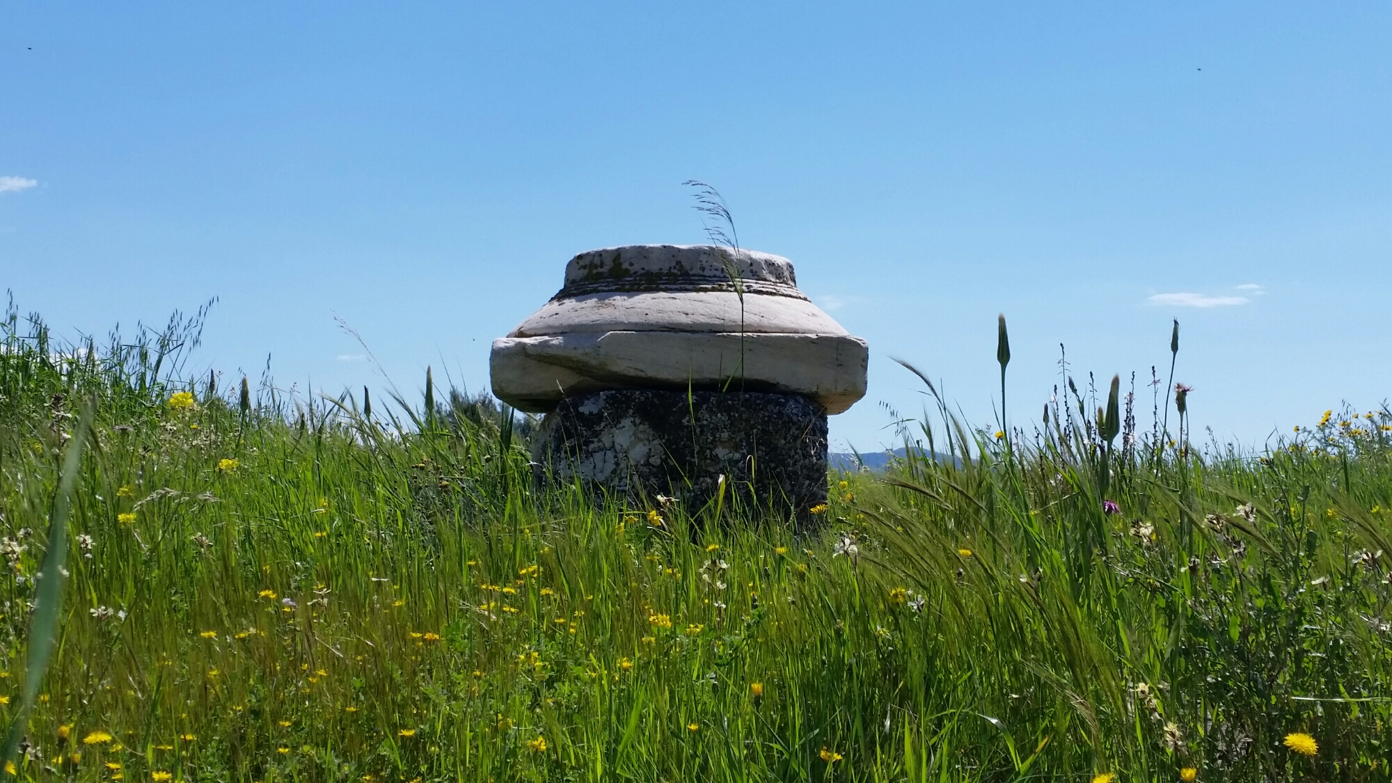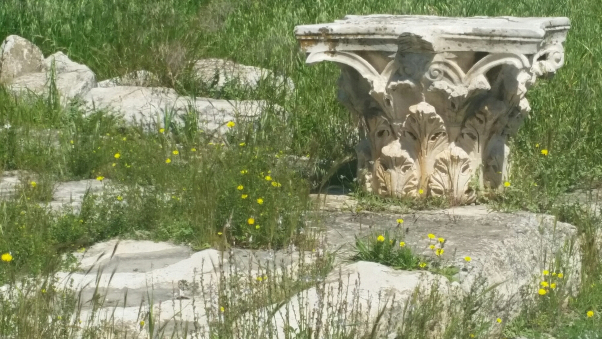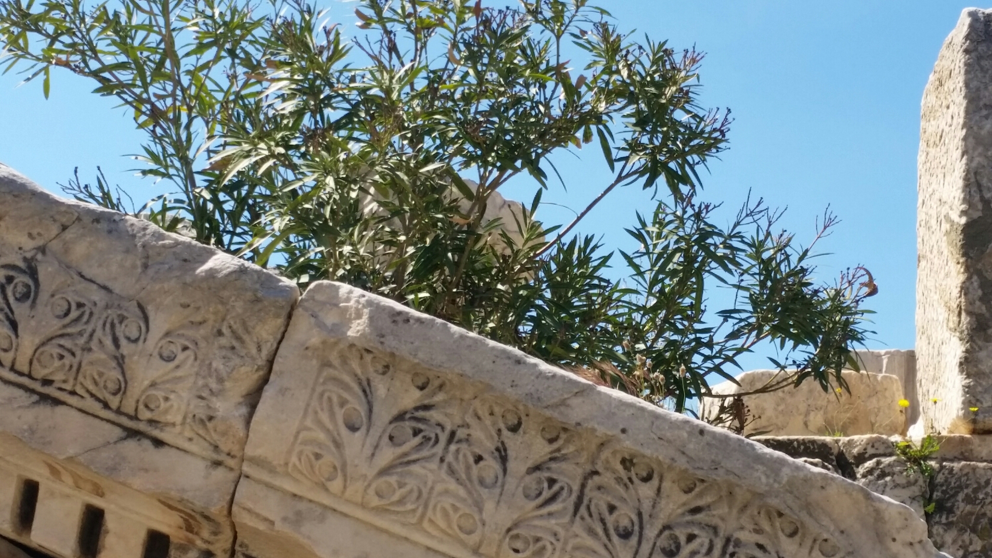We were nearly the sole visitors to the archaeological remains of Eleusis, where the Eleusinian Mysteries were celebrated in a temple to which access was restricted and which seated over 3,000.   All the remains and fragments of the several temples are rather arbitrarily arranged, piled up indiscriminately as if awaiting rearrangement one day – the remains of columns, inscriptions, a marble foot – all excavated some time ago and left evocatively in amongst the wild flowers:-