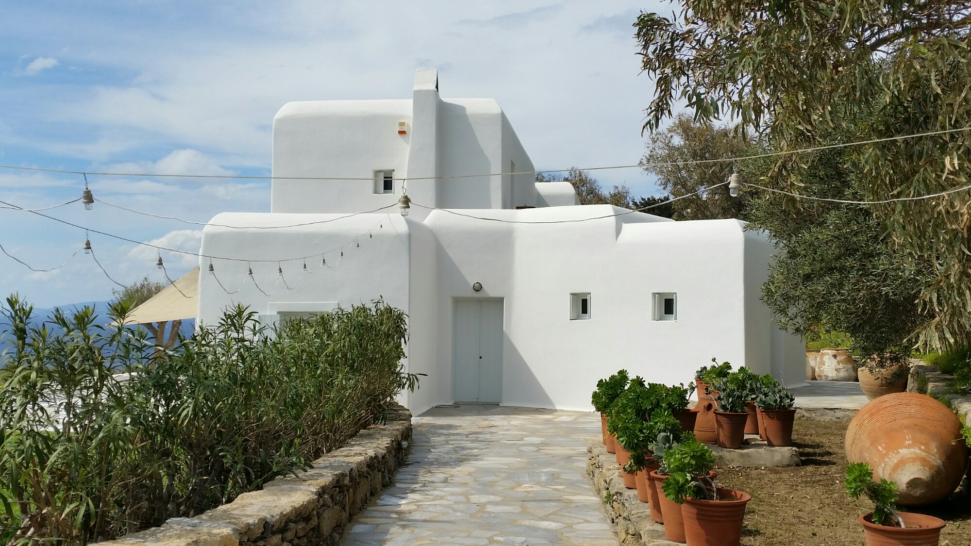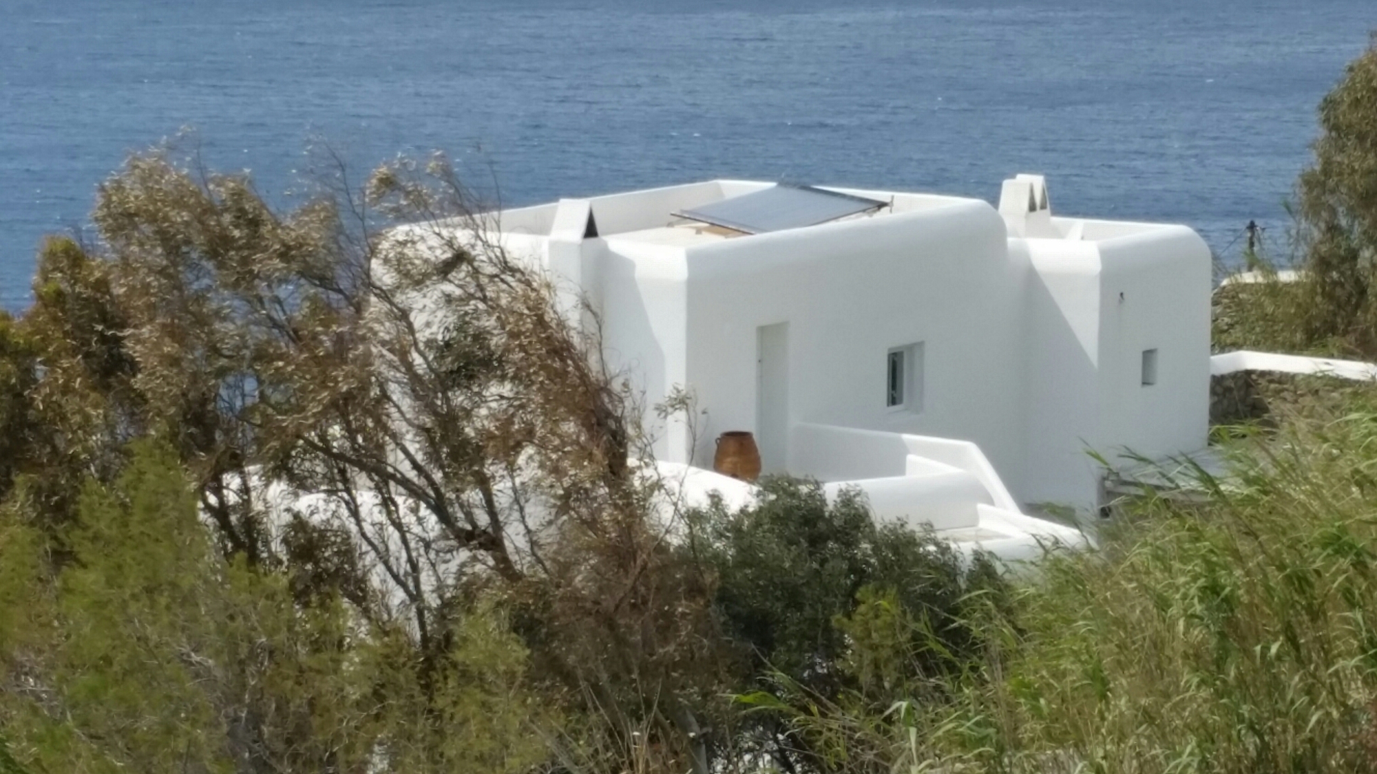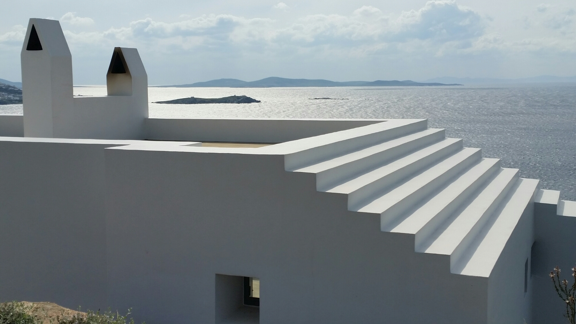 We are staying on Mykonos in a villa designed by Marc Corbiau, a Belgian architect who has perfected a combination of well-considered sybaritic modernism with a sculptural approach to the Mykonoan vernacular:-