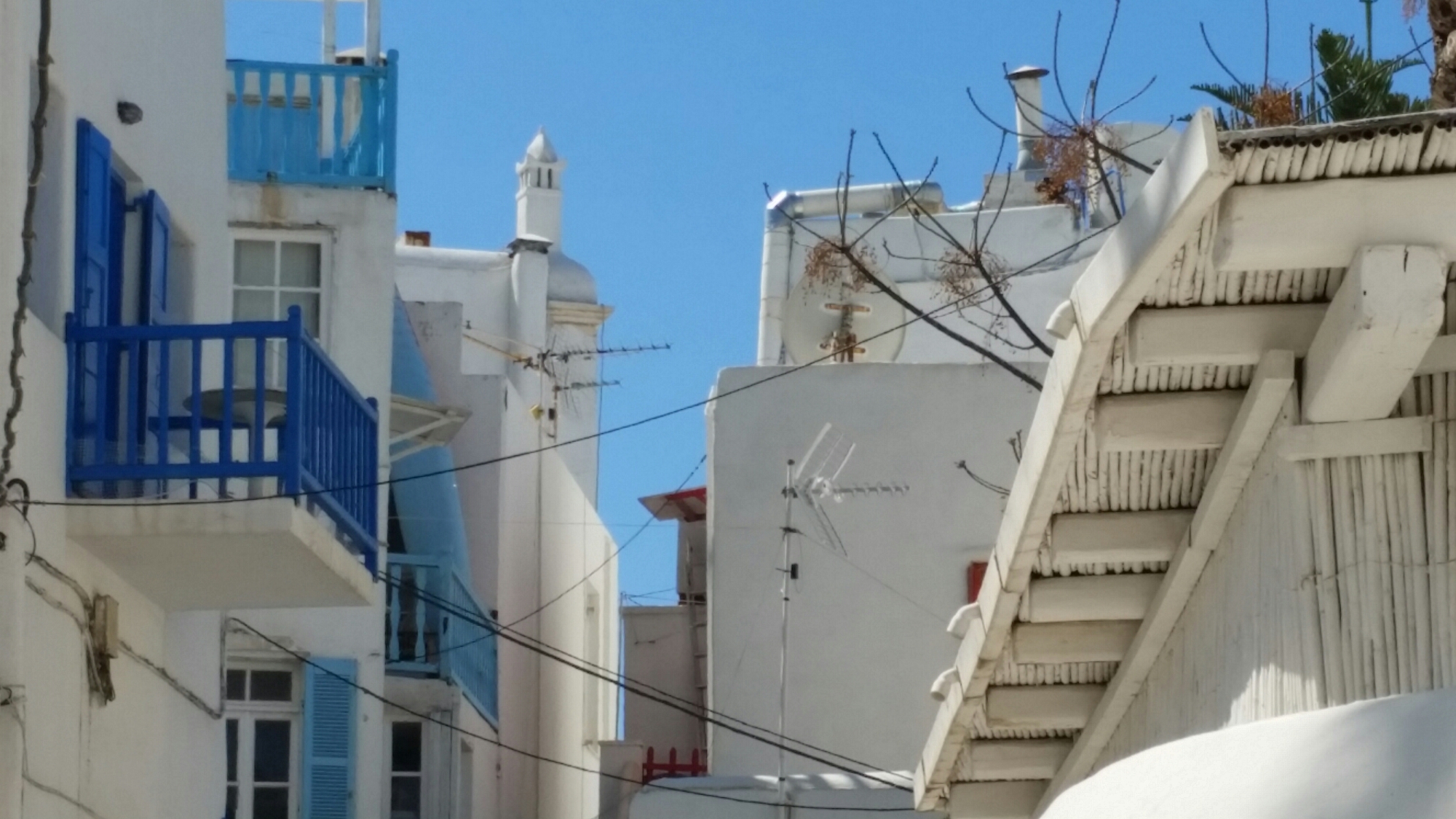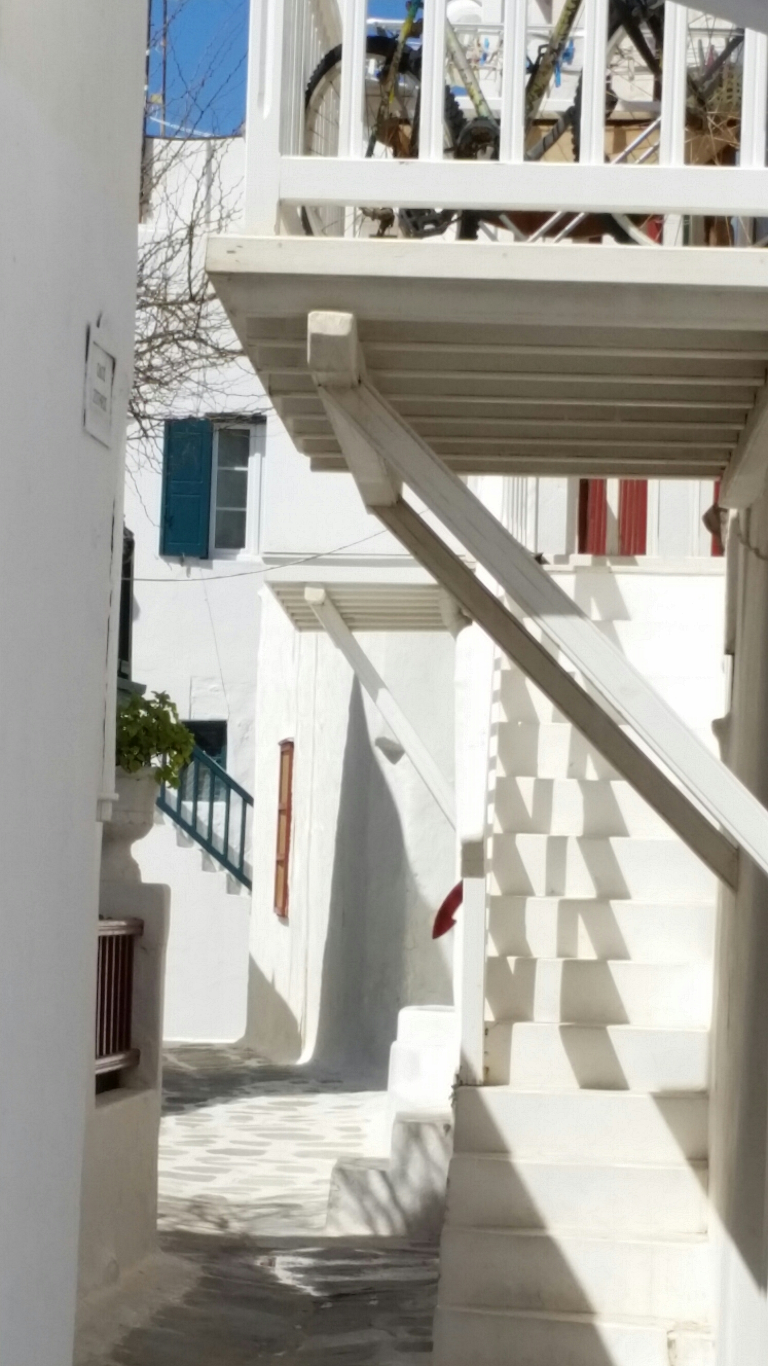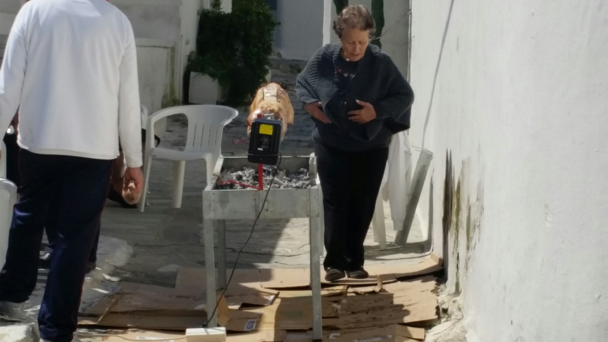 I walked through the backstreets of Chora on Easter morning (Greek Easter) which were empty but for a few lone Japanese tourists and a family roasting a suckling pig – or maybe it was paschal lamb – in the street. It was uncannily quiet after the Easter parade with candles sent from Jerusalem and there was a blue blue sky:-