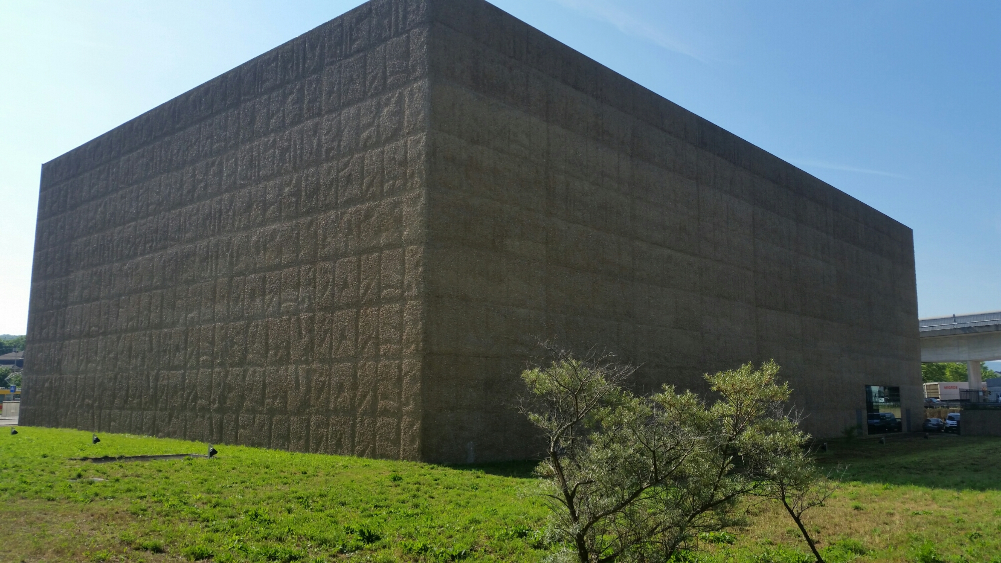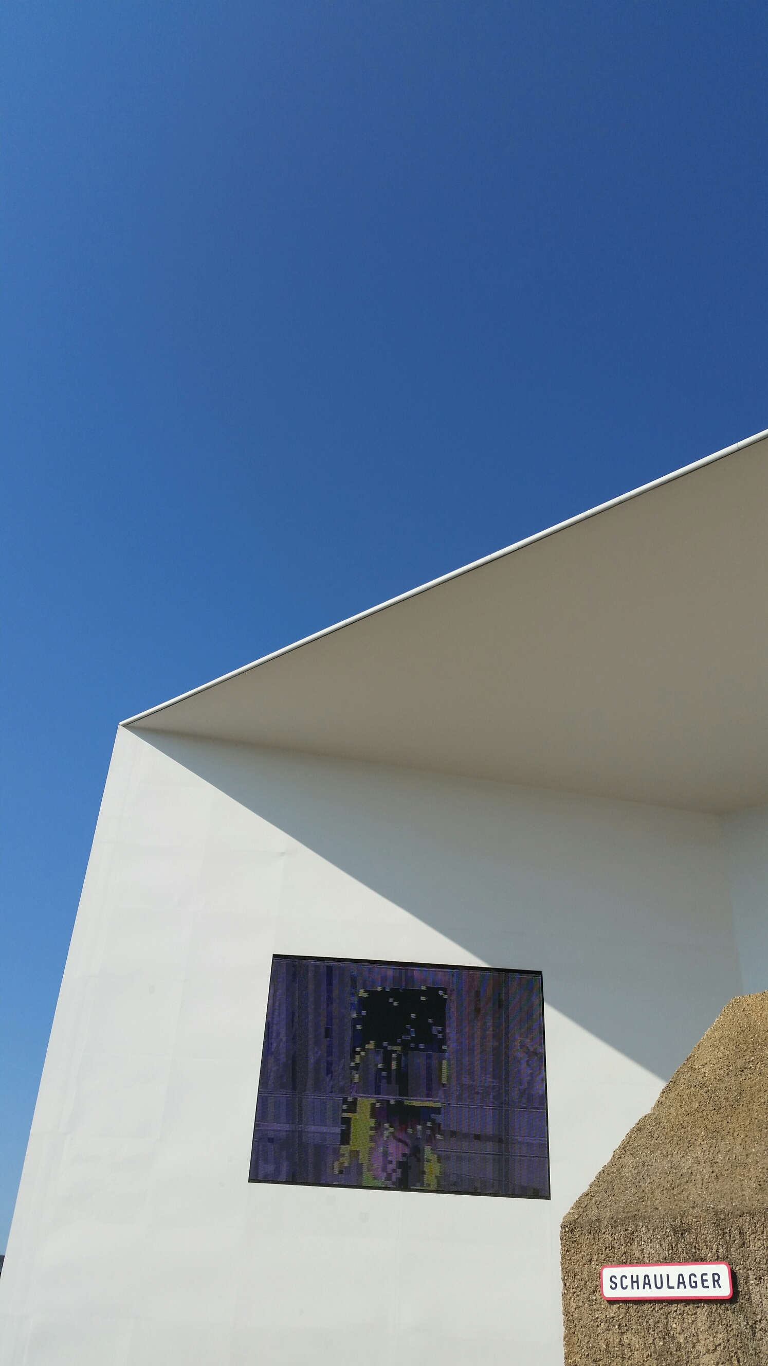 We set off to see the Schaulager, one of Basel’s multiple museums, designed, like so much else in Basel, by Jacques Herzog and Pierre de Meuron for the Emanuel Hoffmann Foundation and opened in 2003. It’s not the most beautiful building, a big brown biscuit on three sides, like a Weetabix, with an entrance façade with two large video screens:-