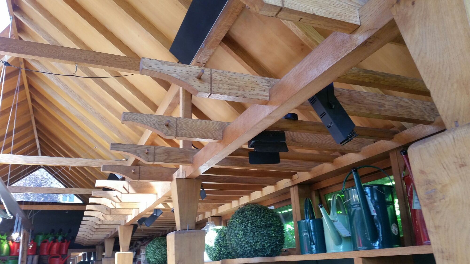 I show the wooden detailing on the wooden cross beams in the roof of Jeremy and Fenella Dixon’s design for Clifton Nurseries, which are very obviously, as he said, based on the wooden pergola at the Hill in Hampstead. They were part of a project to provide a shop alongside the greenhouses, commissioned by Jacob Rothschild on the recommendation of Charles Jencks:-