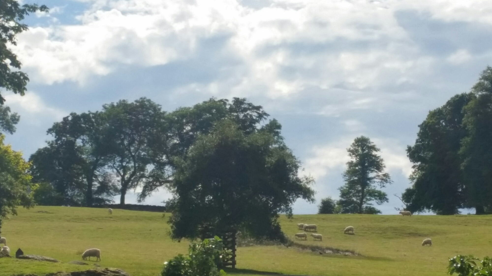 You approach up a long drive with moss-covered banks which open up to fields:-