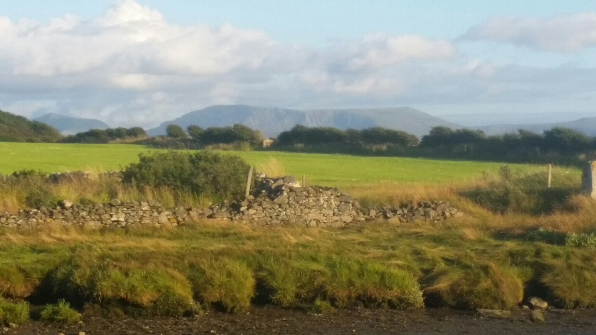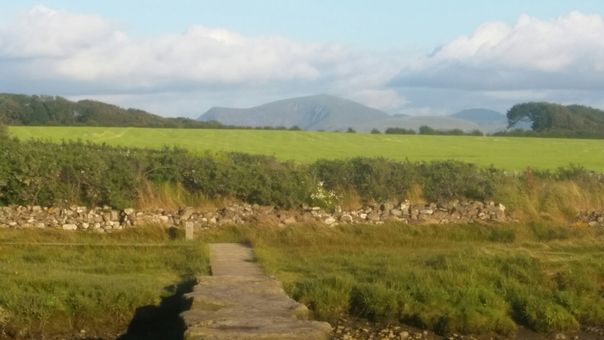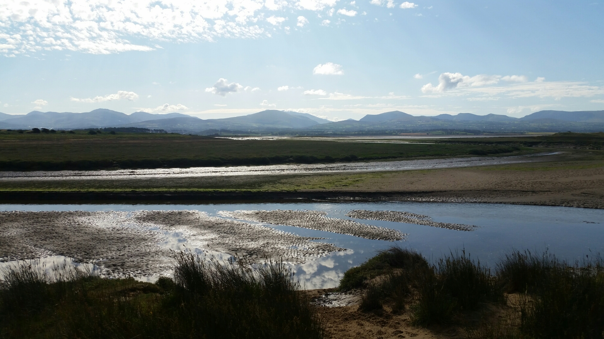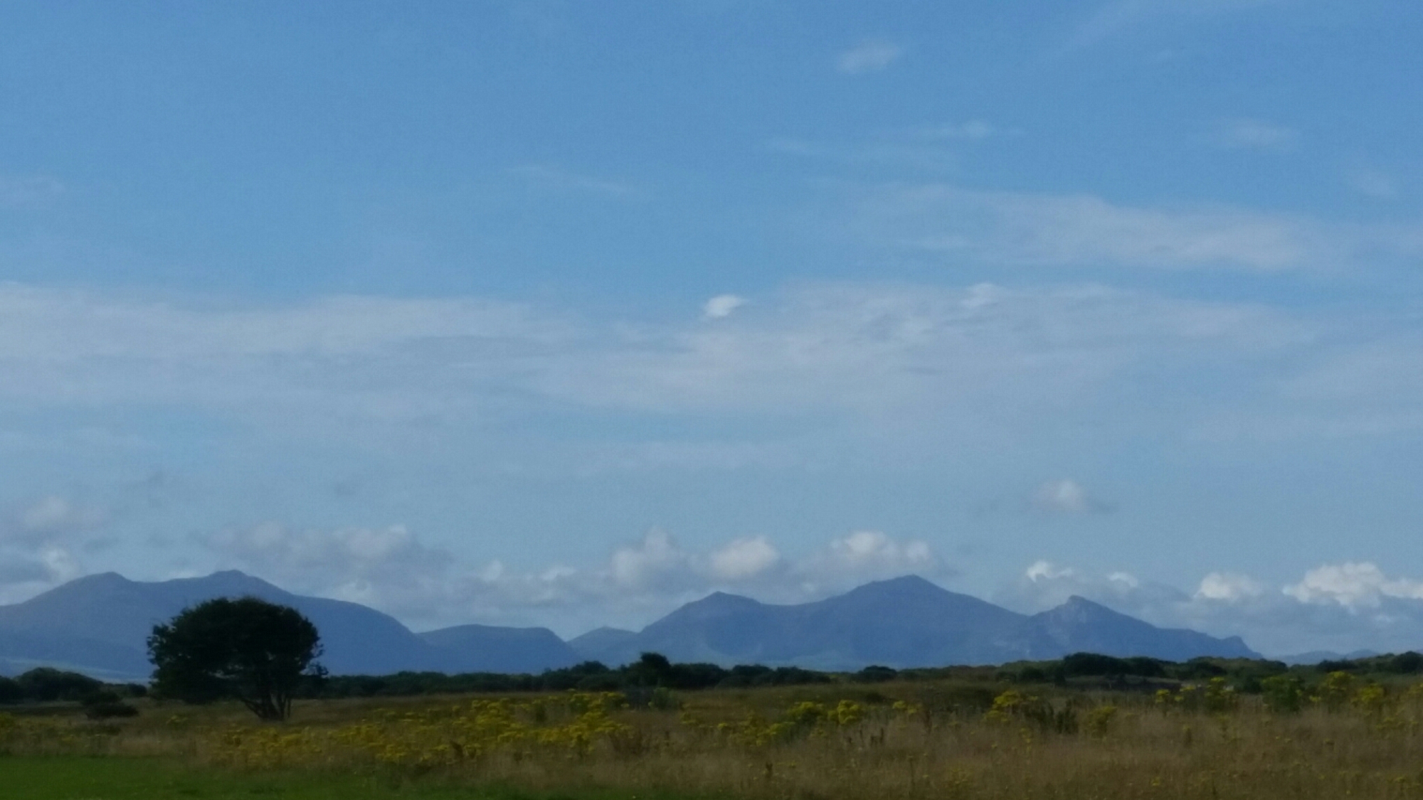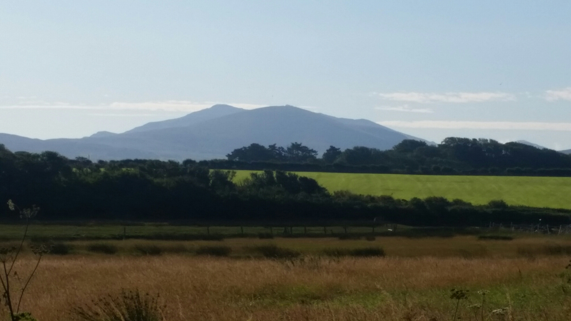 We face the hills: the long line of mountains and low peaks which stretch westwards from above Conway along a line which includes Snowdon itself towards the Lleyn Peninsula and the Atlantic beyond. They are often visible only in outline, like the background of a Japanese print, only occasionally so clear that it is possible to see the smoke from the narrow guage railway.
