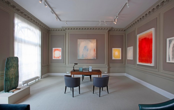 It was the opening night of the PRA’s small, but choice exhibition on the top floor of Colnaghi’s in Bond Street where the work looked really good in spite of the heat of the private view: big, bold, hotly coloured watercolours, red and orange, freely painted; monoprint woodcuts, all of which had been bought by the time I arrived; small-scale, table sculptures, most of which had also already been sold; and a single rug of three commissioned by Christopher Farr, one of which – the one in the exhibition – had been woven in Afghanistan:-