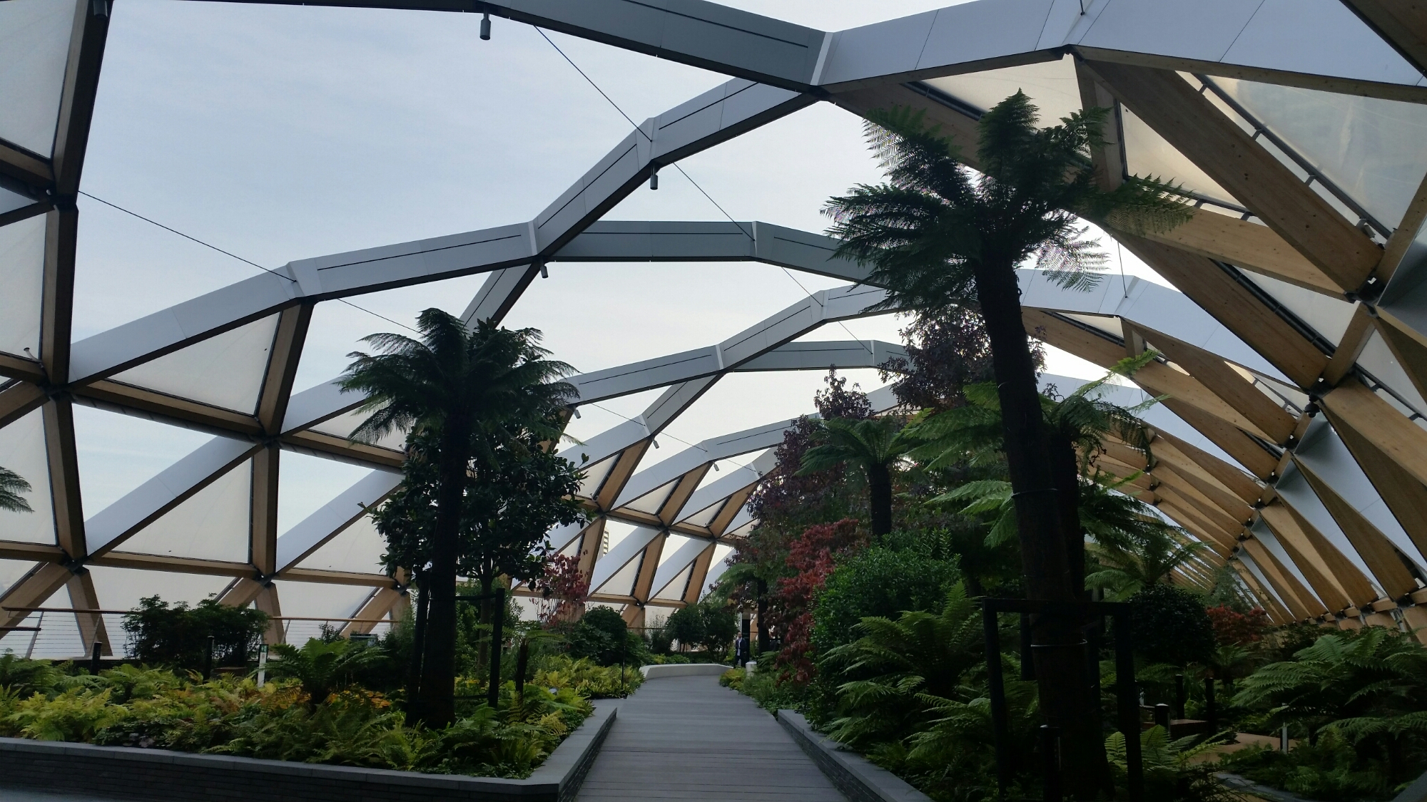We went to explore the new Norman Foster building which has been attached to the north side of Canary Wharf and will in due course house its Crossrail Station. It’s a mixture of ballooning high tech and craft detailing in the engineered wooden struts: currently a bit bland because it’s not yet functioning, but with an elaborate antipodean roof garden:-