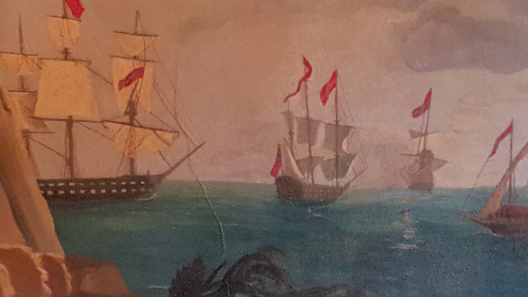 Soho House itself occupies a building of the 1730s, first owned by the seventh Earl of Abercorn, who wrote about magnetism. There is an unexpected mural painting on the staircase by an eighteenth-century theatrical painter called John Devoto. It looks as if it might be by Rex Whistler:-