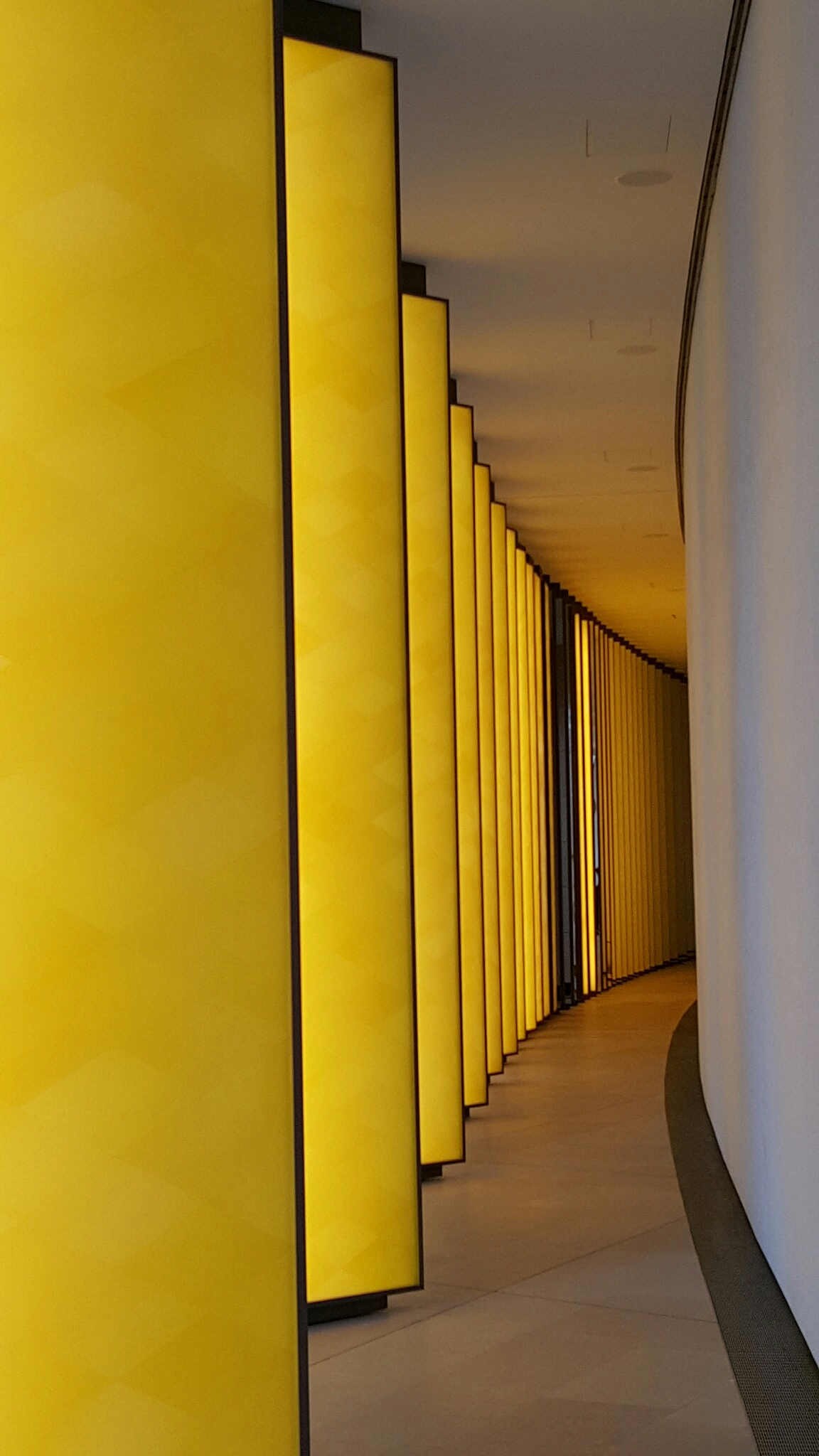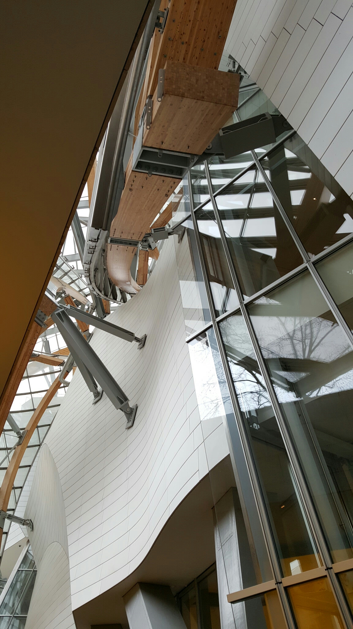 Plans for the Fondation Louis Vuitton were drawn up by Frank Gehry in 2000.   It then took a long period of gestation, including difficult discussions with structural engineers, before opening in the Bois de Boulogne in October 2014.   It’s an incredibly grandly theatrical building, generously proportioned, with an excess of mechanical swooping over and towards the viewer and a series of roof terraces from which one can view the surrounding countryside:-
