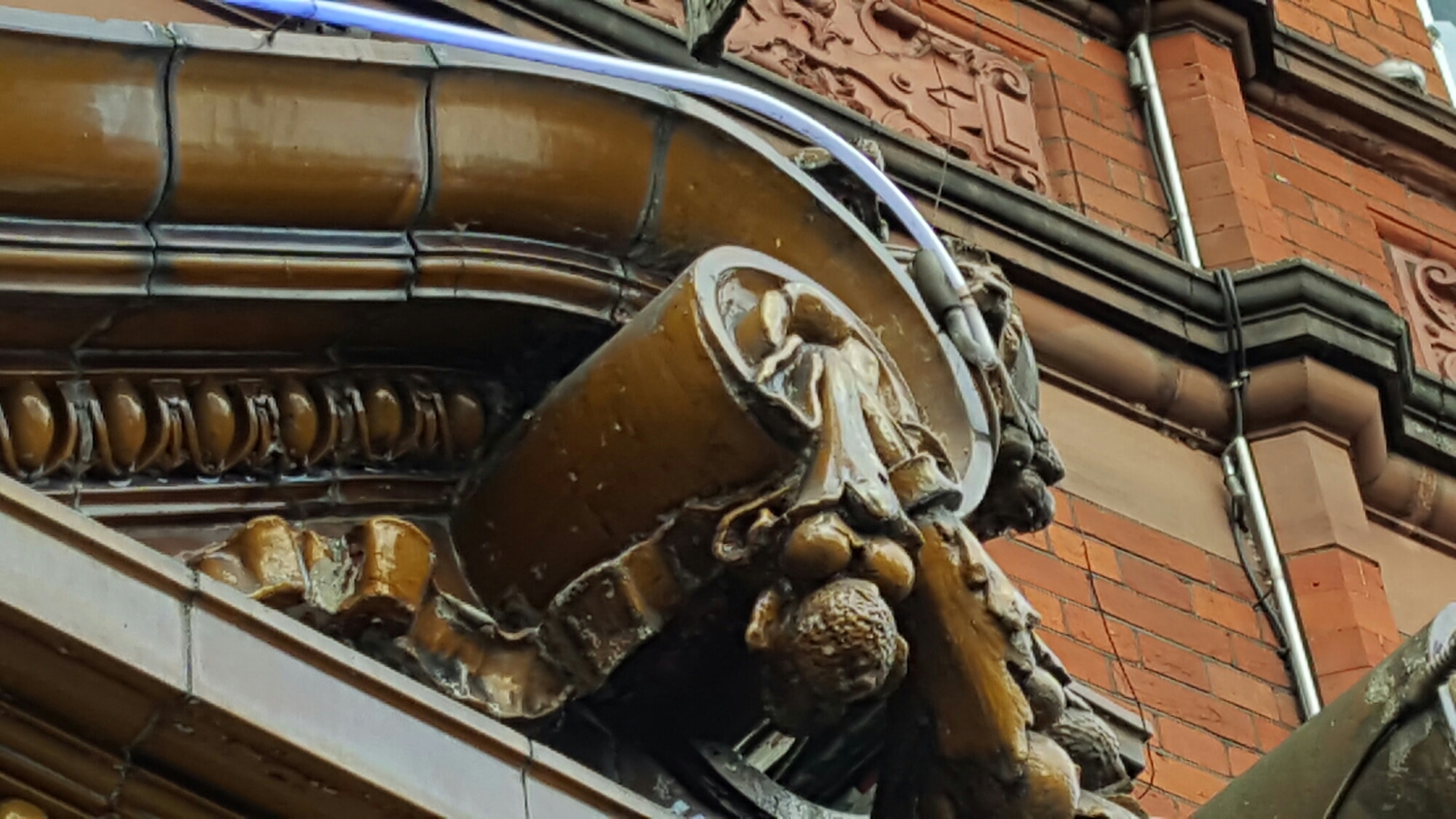 At the lower end of the Hackney Road where it meets Shoreditch, there is what I thought was a deserted pub, but turns out to be a striptease joint, called Ye Olde Axe, which looks slightly as if it belongs in the Wild West with its turret and pub sign swinging in the wind, but has good terracotta lettering and very fine capitals:-