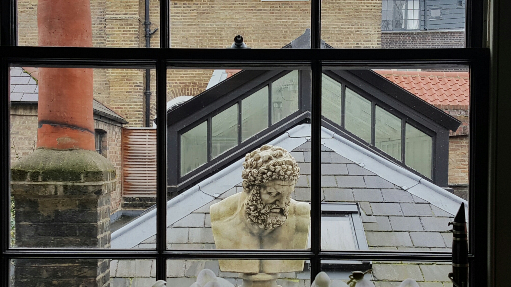 I went to see Miranda Argyle’s very nice small exhibition upstairs in Chris Dyson’s drawing room at 11, Princelet Street. I should probably have photographed the work, but it is quite delicate, made up in many cases of stitching on linen, intermingled with dark and atmospheric photographs. Instead, I took photographs out of the window at the back:-