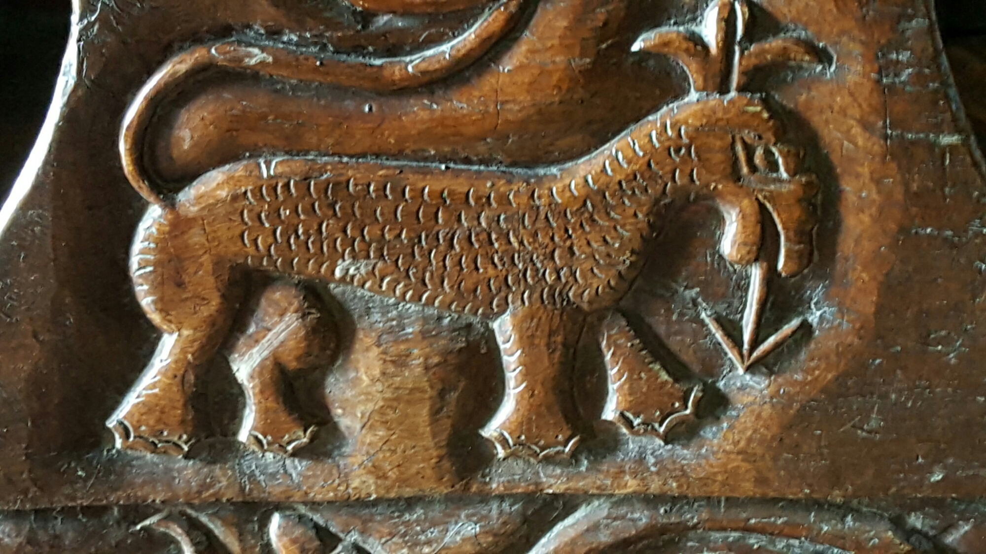 We stopped on the way back to London at Rug Chapel, the private chapel of Colonel William Salesbury, the Governor of Denbigh Castle. It’s an astonishing and ecclesiastically extravagant display of carved and painted woodwork, dating from 1637, just before the Civil War.