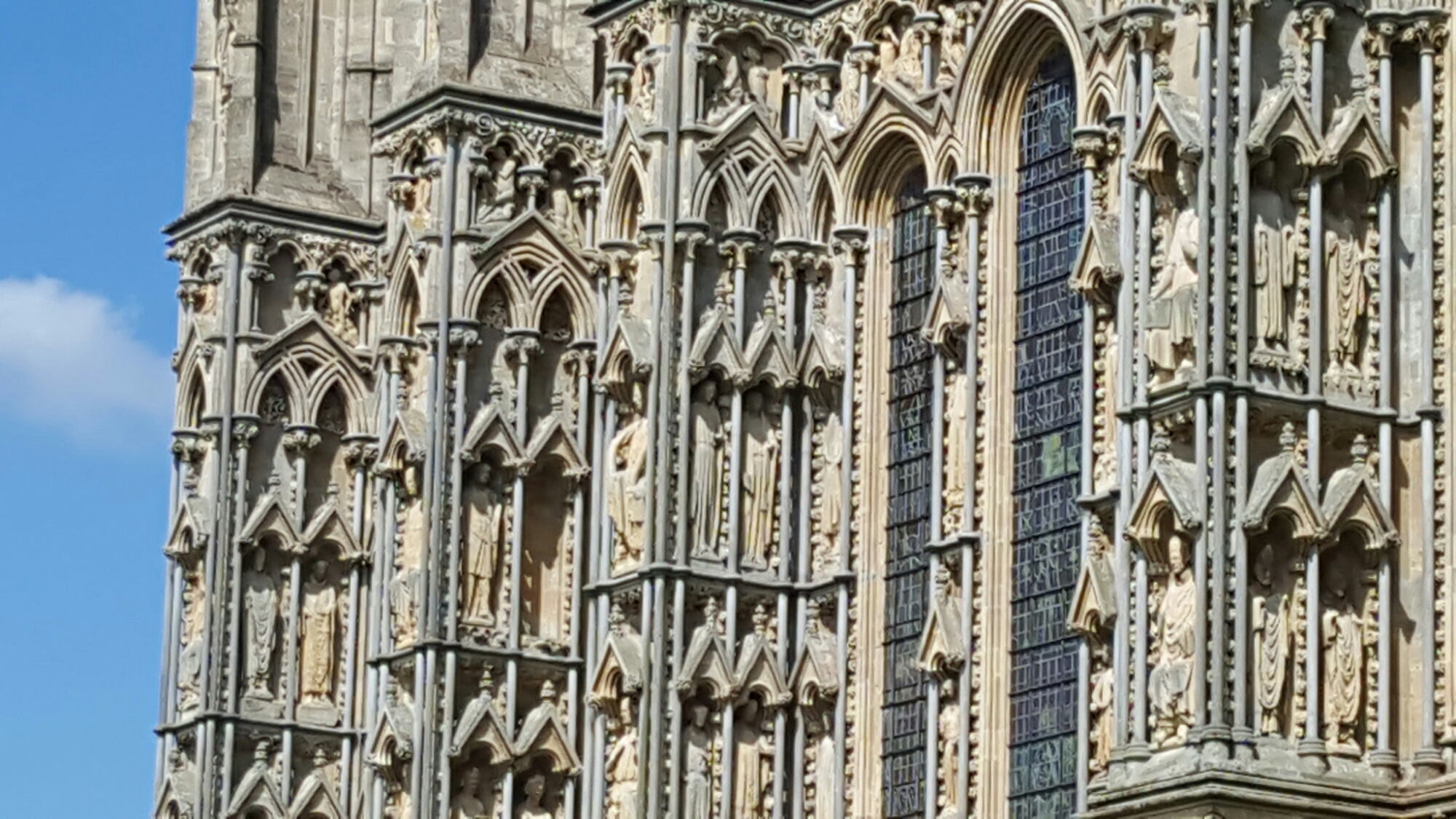 We had a guided tour of the west front, originally grandly polychromatic and constructed between 1215 and 1248 under the supervision of Adam Lock and Thomas Norreys:-