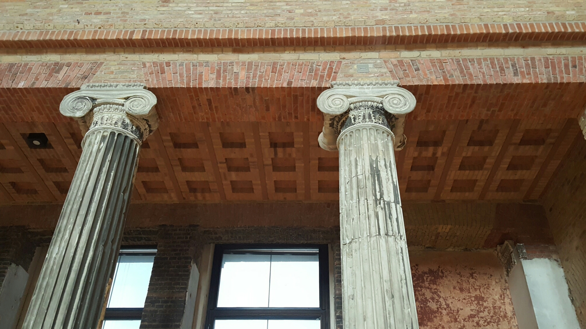 Inside, one finds the Chipperfield palette of materials – smooth concrete, precast concrete mixed with marble aggregate chips for the floor, a great deal of original brickwork, dark wood and bronze:-