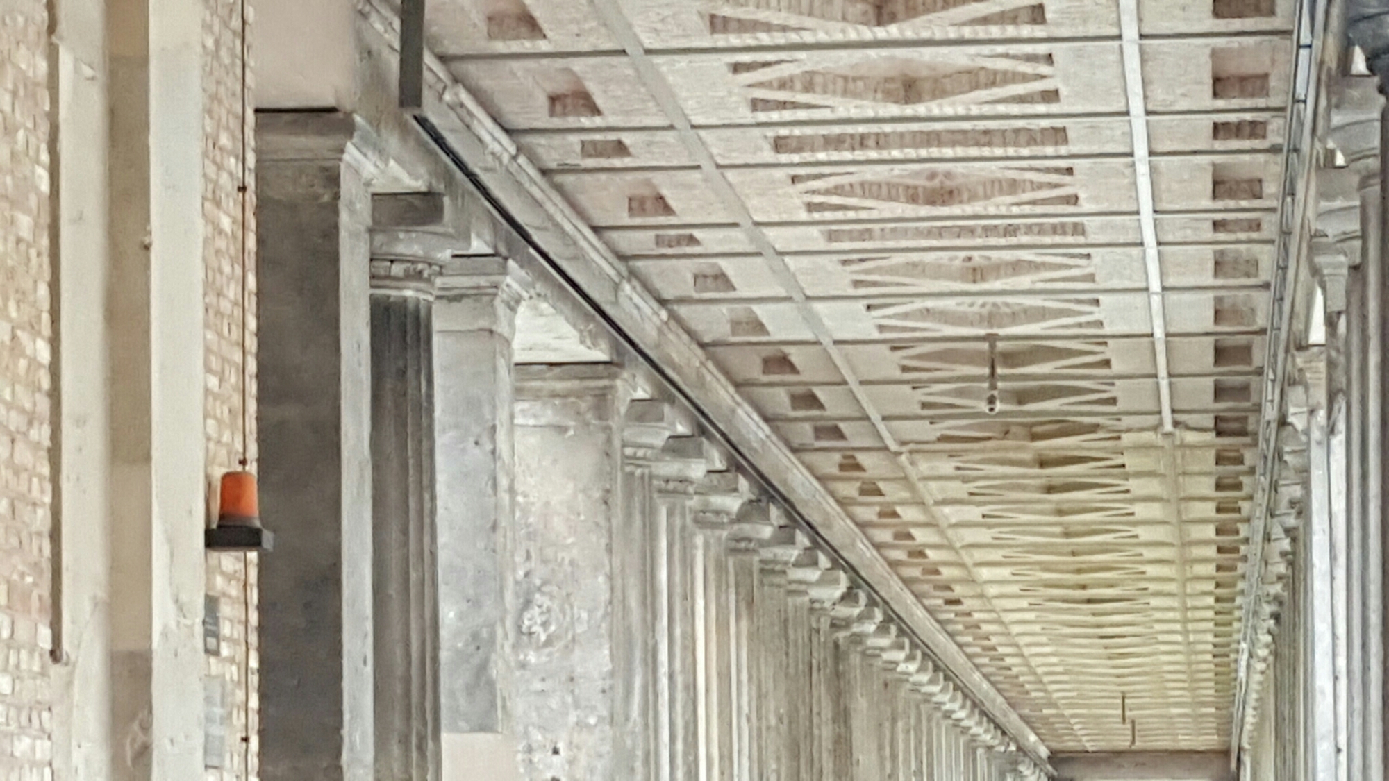 We went to the Neues Museum, Friedrich Stüler’s great classical building on the banks of the river Spree, bombed in the war and left semi-derelict until its reconstruction was announced in September 1989, just before the Wall came down. An international competition was then held in 1994. A second competition in 1997 was won jointly by David Chipperfield and Julian Harrap, working in combination and following the brief to retain as much as possible of the original building. We started looking at the exterior – the way that the new and the old are knitted together where the original building was bombed:-