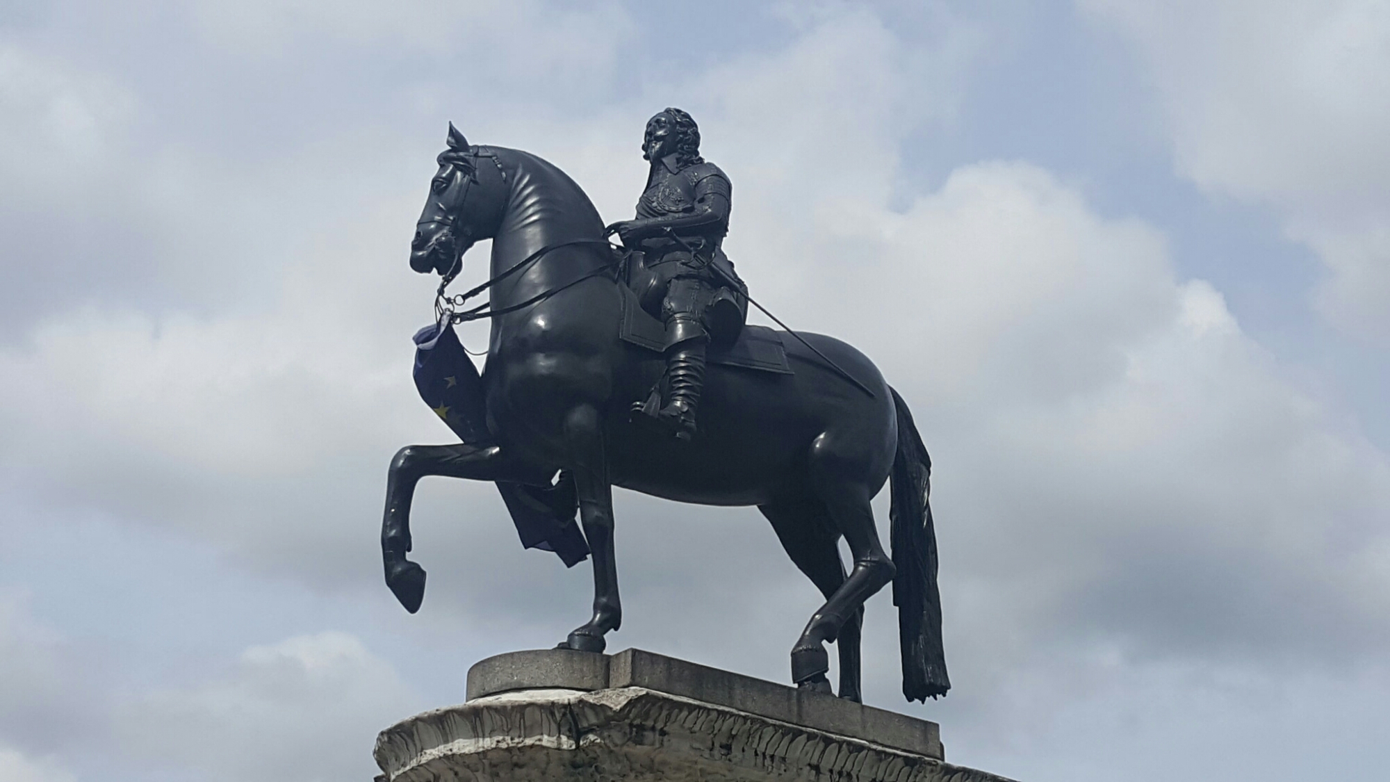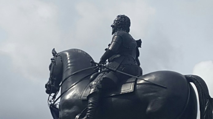 A rare visit to my bank gave me an opportunity to have a good look at the equestrian statue of Charles I which sits in the middle of the roundabout at the top end of Whitehall and must be one of the most difficult works of art in the world to see and appreciate. The statue was commissioned by Charles I’s Lord High Treasurer in 1630 for his country house at Roehampton (the date 1633 is inscribed on the horse’s front foot). It was sold during the civil war to a metalsmith called John Rivet, who instead of breaking it up, hid it, pretended to sell spoons made from it and enabled it to be re-erected in 1675 on a pedestal, now very worn, by Joshua Marshall:-