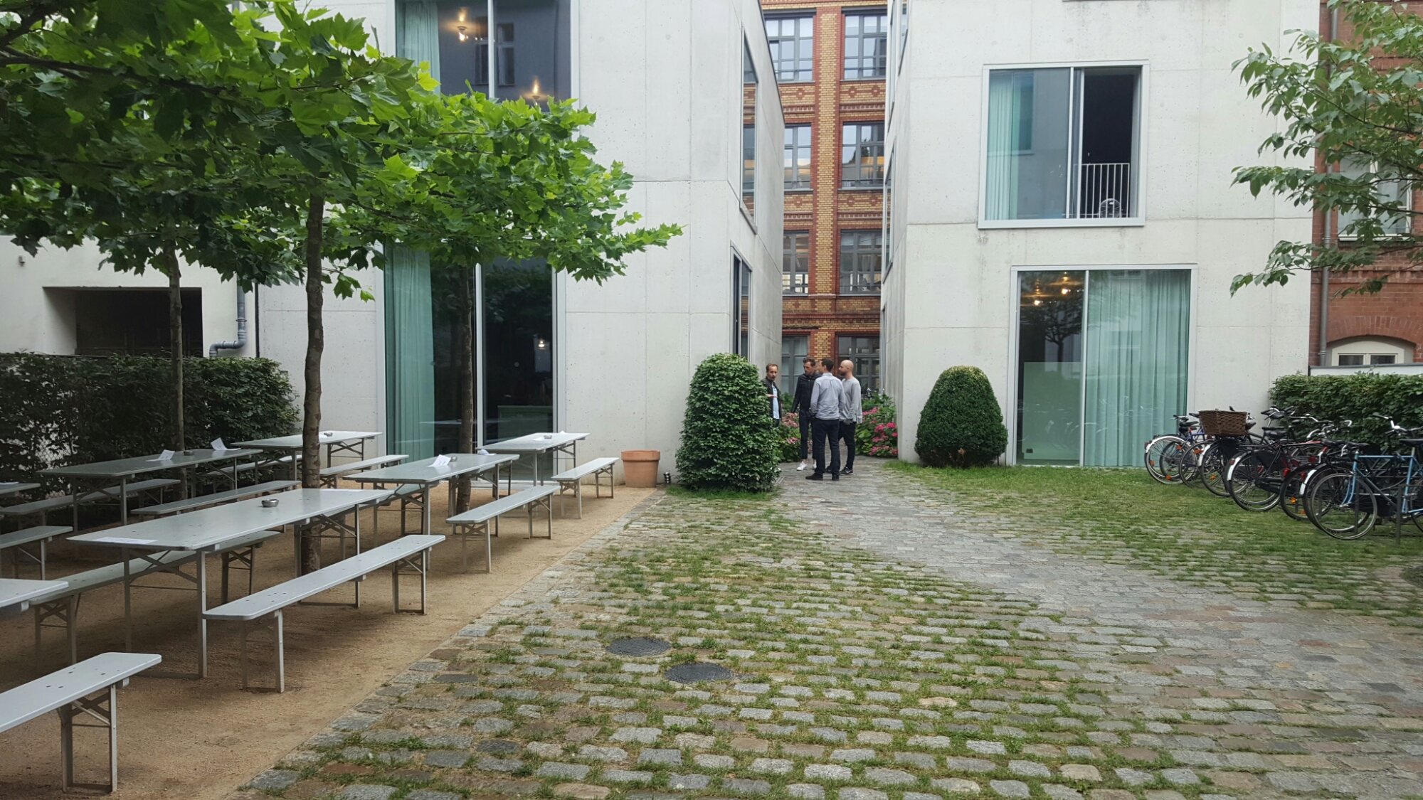 We went to visit David Chipperfield’s Berlin headquarters, originally a nineteenth-century factory in Mitte, now with modern additions, including Kanteen – somewhere for the public to eat as well as staff – and a courtyard space designed by Peter Wirtz:-