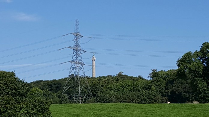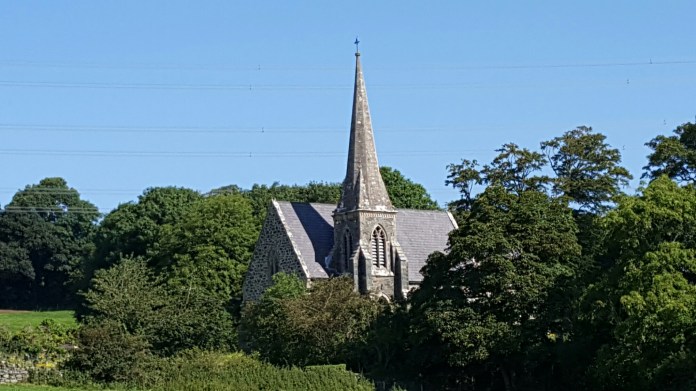 Down a turning off the road into Llanfairpwll, one goes down to the village church of St. Mary, a mid-Victorian building by Henry Kennedy which was locked. But beyond it is the little path down to the Straits and Nelson, with a couple of good slate tombs and a view up across the fields to the monument to the first Marquess of Anglesey, which annoyingly is closed for the foreseeable future.