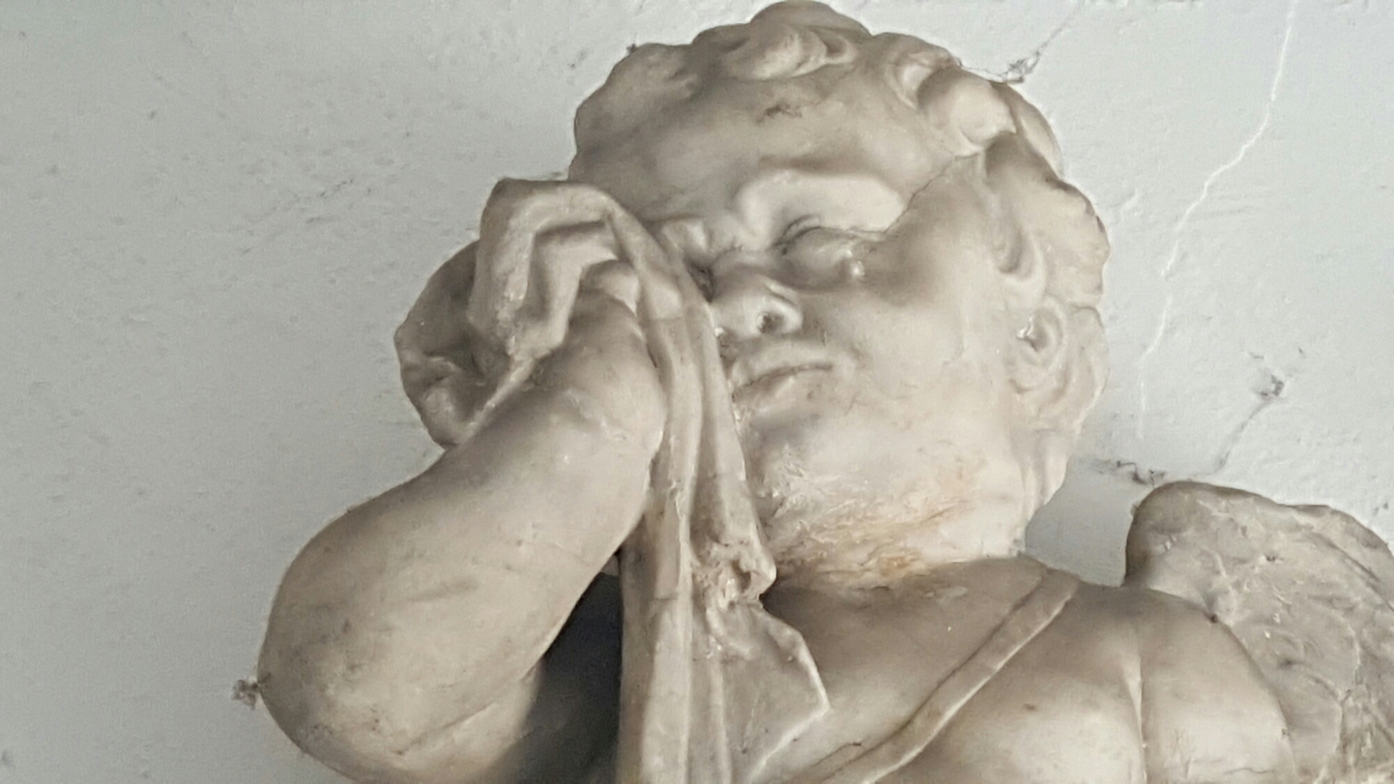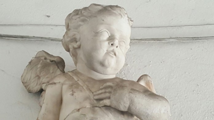 As one enters the church, there are two cherubs preserved from a tomb, one weeping:-