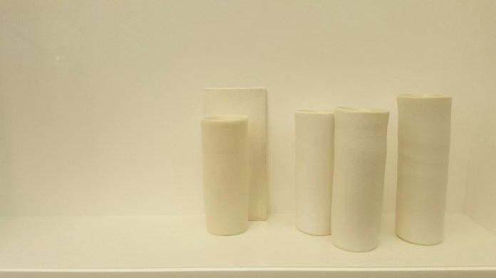 I wasn’t going to do a post from Frieze London having exhausted my blogging tendencies in going through Frieze Masters, but was struck by the recent work by Edmund de Waal which has an exhibition to itself at Gagosian. Since I’m lecturing about him (and others) on Friday in north Norfolk, I was pleased to see the whiteness and extreme mimimalism return, as well as the austerity of the spacing (they are actually all white and it’s only the camera which makes them yellow):-