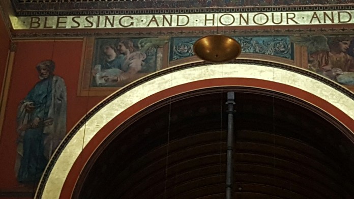 I am pleased to have a chance to see and get to know H.H. Richardson’s Trinity Church, which dominates Copley Square opposite the Public Library, squat, but grandly ornate, an idiosyncratic composite of Romanesque design, as much German as French, with a magnificent interior space and much good stone carving.   Richardson had been trained at the École des Beaux Arts, returned to the States in 1865, and designed a lunatic asylum in Buffalo before the commission to design Trinity Church:-