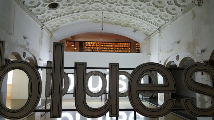 After lunch, we went to the bank he has bought or been given, paid for with ceramic bonds, where he shows art, has a bookshop and library:-