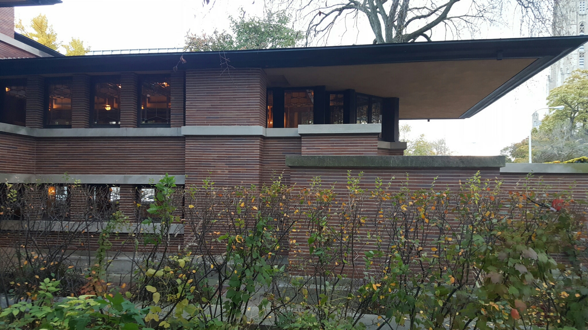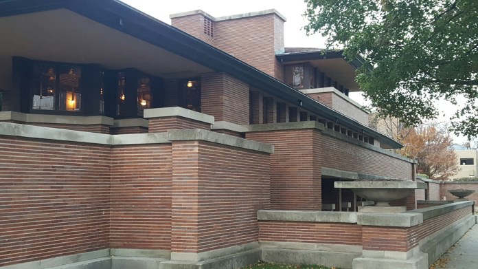 Last stop was the Robie House, built by Frank Lloyd Wright for Frederick C. Robie, the assistant manager of the Excelsior Supply Company, and his wife, Lora Hieronymus Robie, and stuffed full of new technology, including multiple bathrooms, an automatic vacuum system and a three-car garage. It seemed a curious mixture of functional efficiency and ornate, highly decorated opulence, with dividing walls removed and unexpectedly low ceilings to maintain the vigorous horizontality of the overall, low-slung, Prairie School design, Frank Lloyd Wright’s last work in Chicago, immortalised in his Wasmuth Portfolio:-