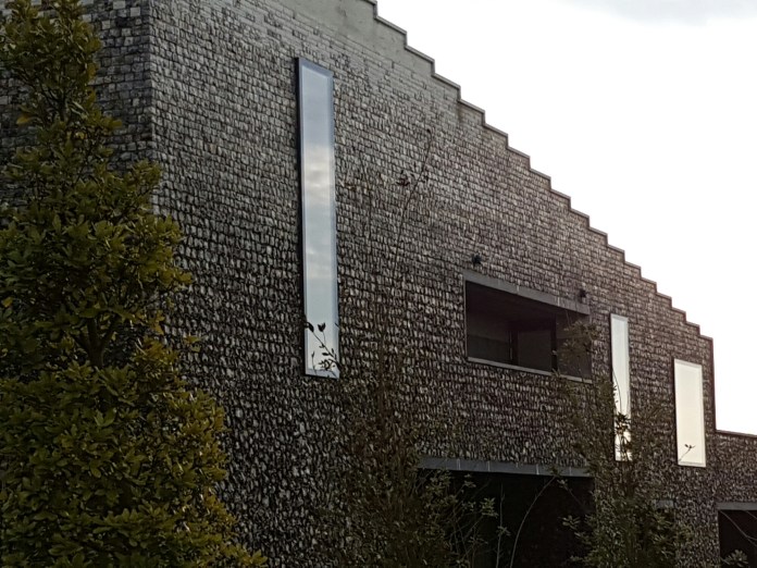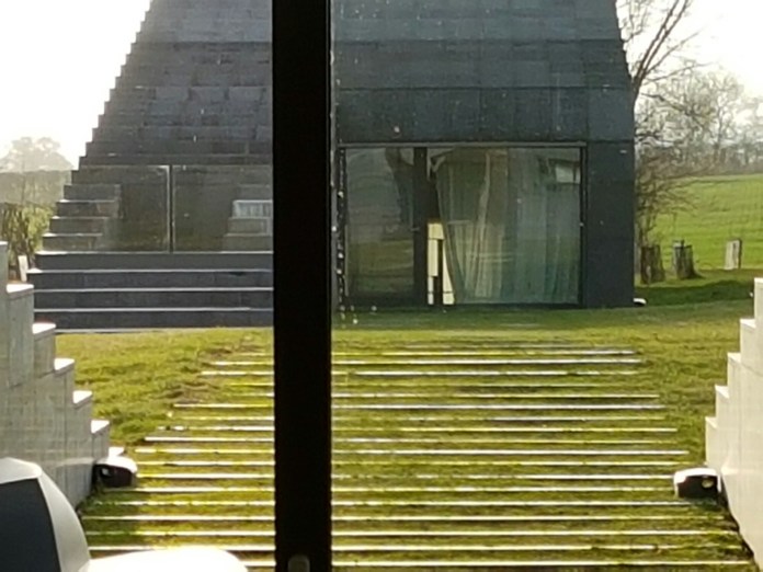 I had been particularly looking forward to seeing the Flint House, designed by Charlotte Skene-Catling in a style part rustic and part Ledoux, split in the middle between a guest house and the main building and with a roof which one can walk up and sit on, to survey the surrounding landscape:-