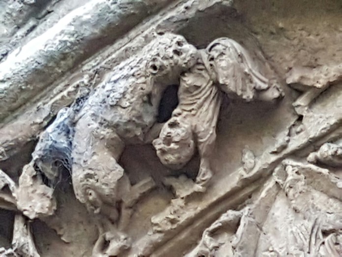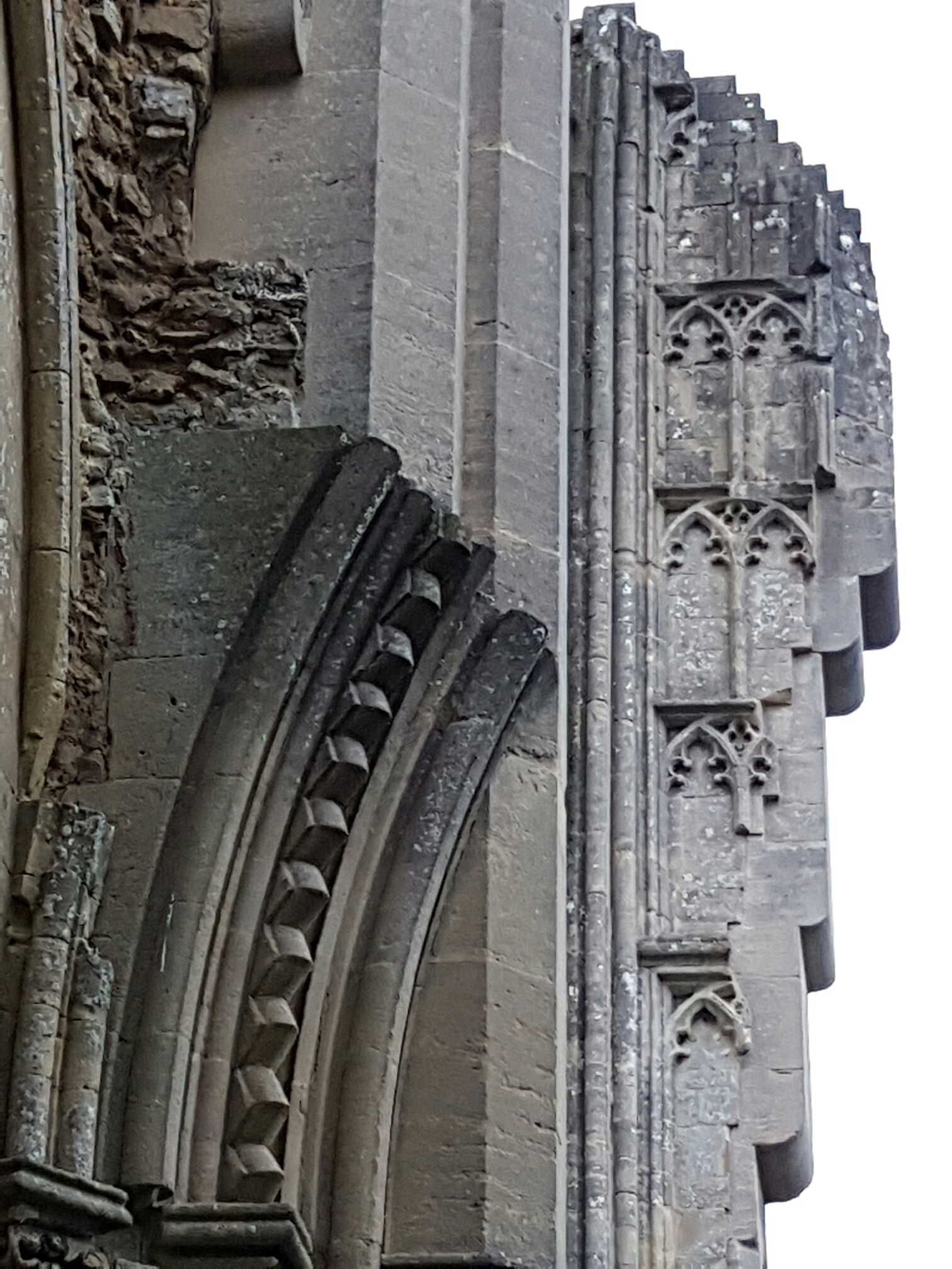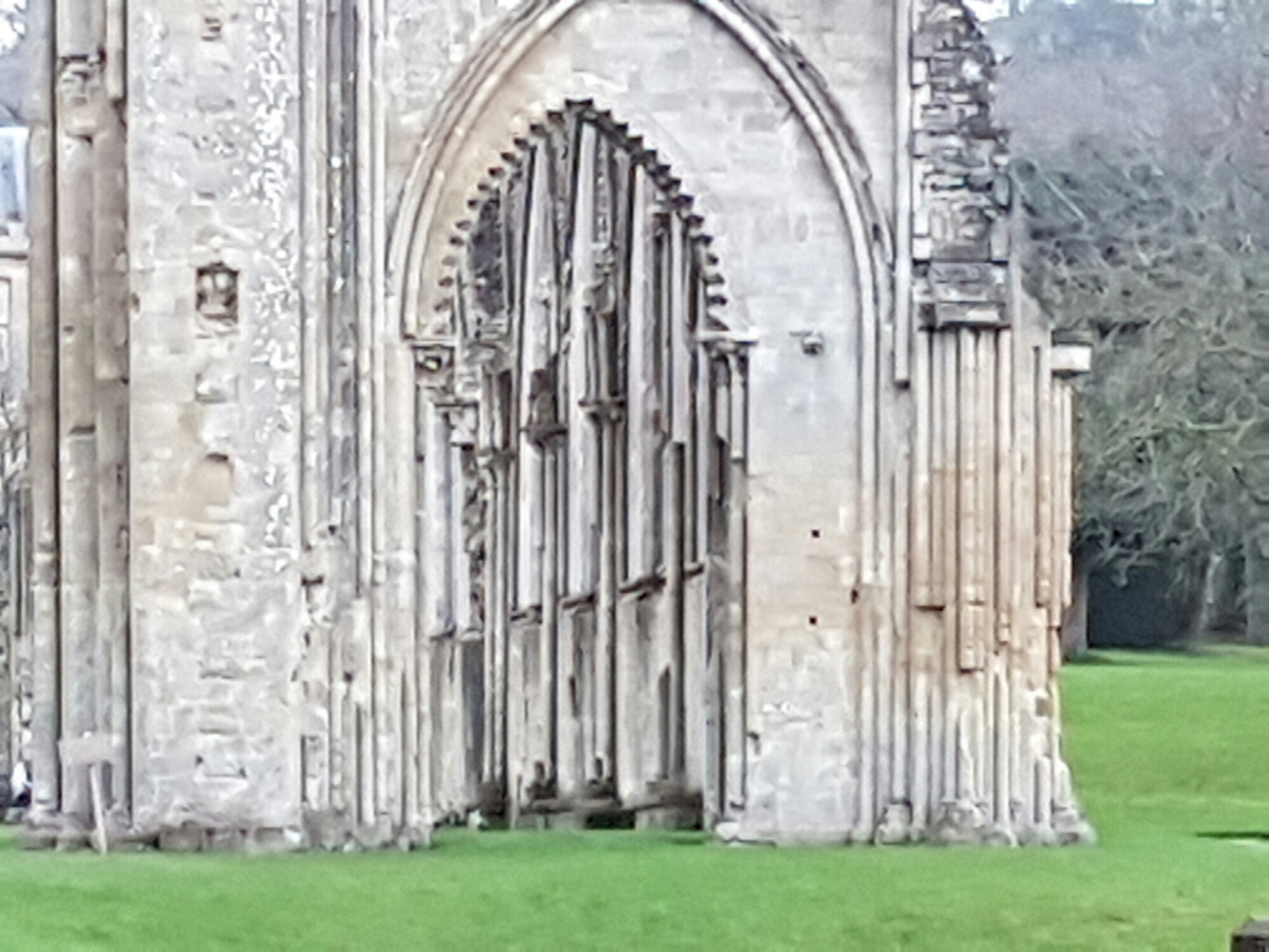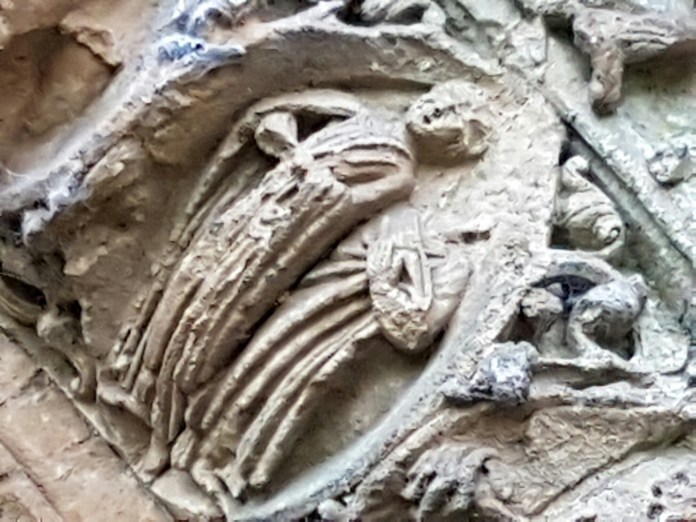 We drove to Glastonbury Abbey across the marshes to admire its late Romanesque portal showing the Life of Mary, beginning with the Annunciation, through the Visitation, with a bestiary in the outer voussoir. It was constructed after a fire in 1184, overseen by Henry II’s chamberlain, Ralph Fitzstephen ‘building it of squared stones of the most beautiful workmanship’ (Adam of Domerham):-