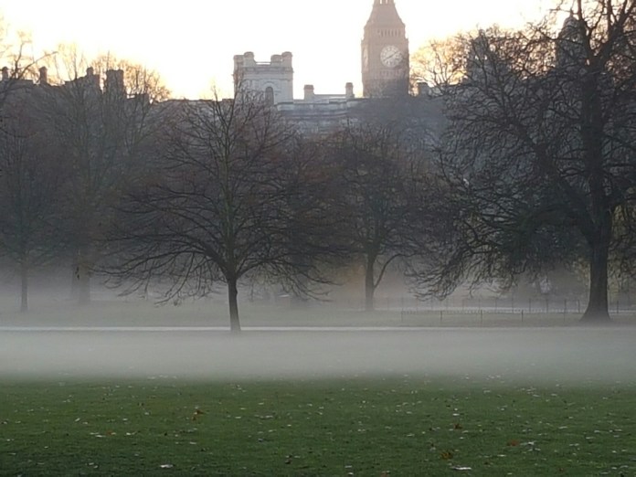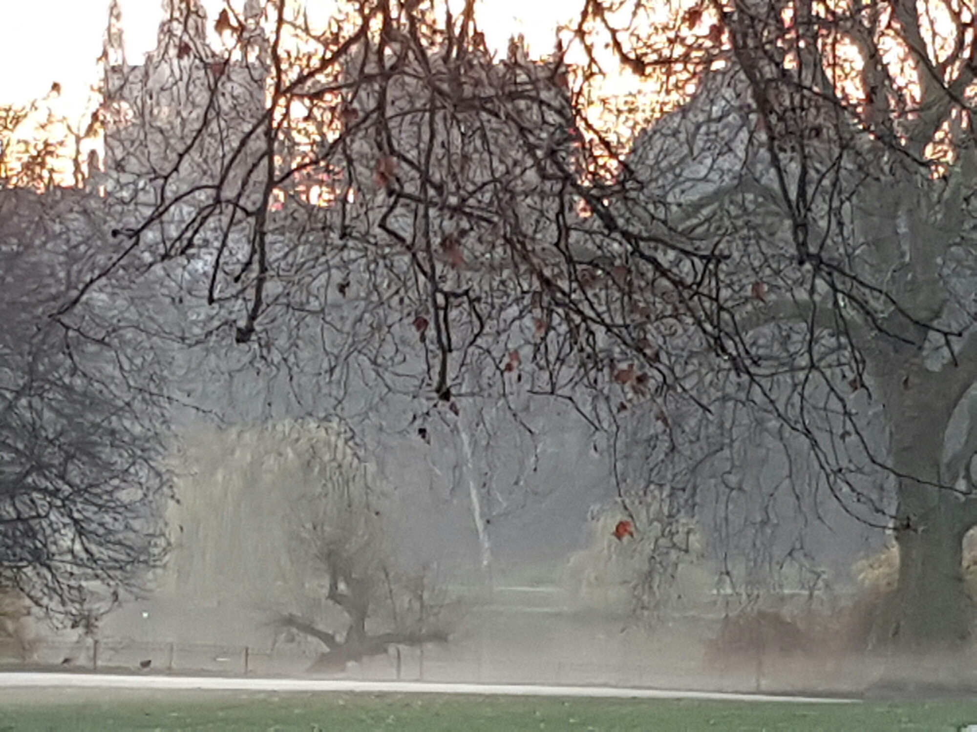 The silence of the blog is not owing to an attack of the widespread influenza, just an overload of Christmas events which leaves little space for anything other than mince pies: the Royal Academy’s Annual Carol Service which I always enjoy and instils a very briefly holy mood; our annual party held jointly with the Evening Standard, for which see tonight’s Londoner’s Diary; and tonight, our annual staff party for which I always feel woefully underdressed, not having spent the last few days devising some fantastical costume, demonstrating the extreme artistic ingenuity and creativity of the RA’s staff. So, the only photographs I have to post are of the mist across St. James’s Park:-