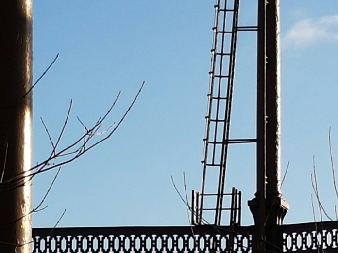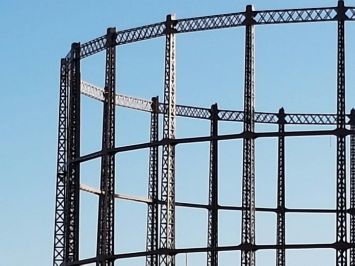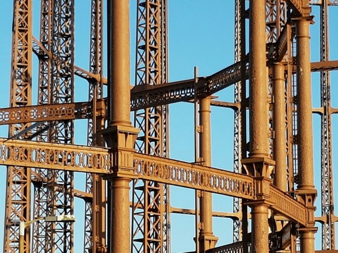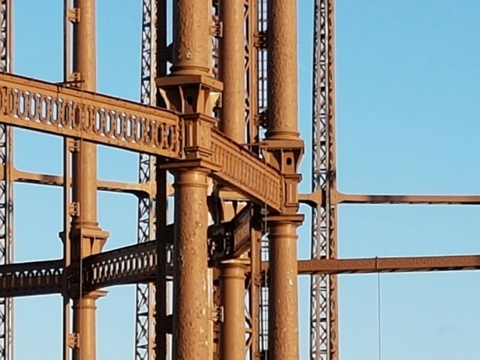 The last of my posts from what turned out to be a long walk on the last day of the Christmas holiday concerns the two great gasholders on the bend of the Regent’s Canal, just near Broadway Market. I received an email telling me – surprise, surprise – that they are likely to be demolished. The smaller one is the earlier, dating from 1866, designed by Joseph Clark, the chief engineer of the gasworks. The bigger one was added in 1889. They supplied gas to the Shoreditch gasworks, which in turn supplied gas for the street lighting of east London:-