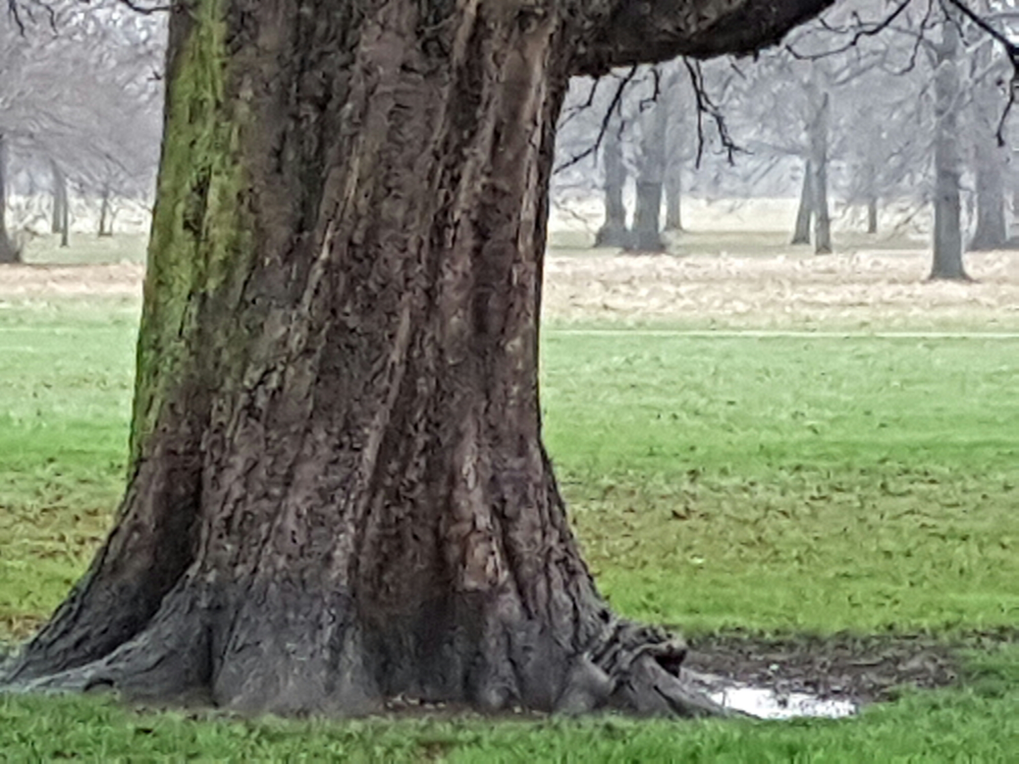 I know Hyde Park much better than I do Kensington Gardens, so took the opportunity of the closure of Lancaster Gate underground station to explore the area round Queensway, including Kensington Gardens, damp, grey and atmospheric on a wet Saturday morning, and including a curious mix of its original formal geometry, as originally laid out by George London and Henry Wise of the Brompton Nurseries, enlarged by Henry Wise for Queen Anne, and then adapted by Charles Bridgeman for Queen Caroline between 1727 and 1731, with grand avenues leading to Kensington Palace, dogs and big rotting trees:-