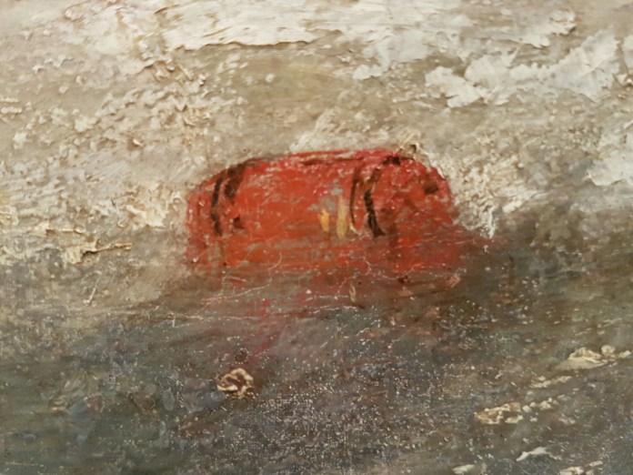 My purpose was to see, and see if we might be able to borrow, Turner’s Helvoetluys – the City of Utrecht, 64, Going to Sea, which was exhibited in the Summer Exhibition in 1832 alongside Constable’s Opening of Waterloo Bridge and which gave rise to the anecdote that Turner added a splash of bright red paint on varnishing day, causing Constable to remark, ‘he has been here and fired a gun’.   There in the painting, in amongst the ships, is a bright red buoy:-