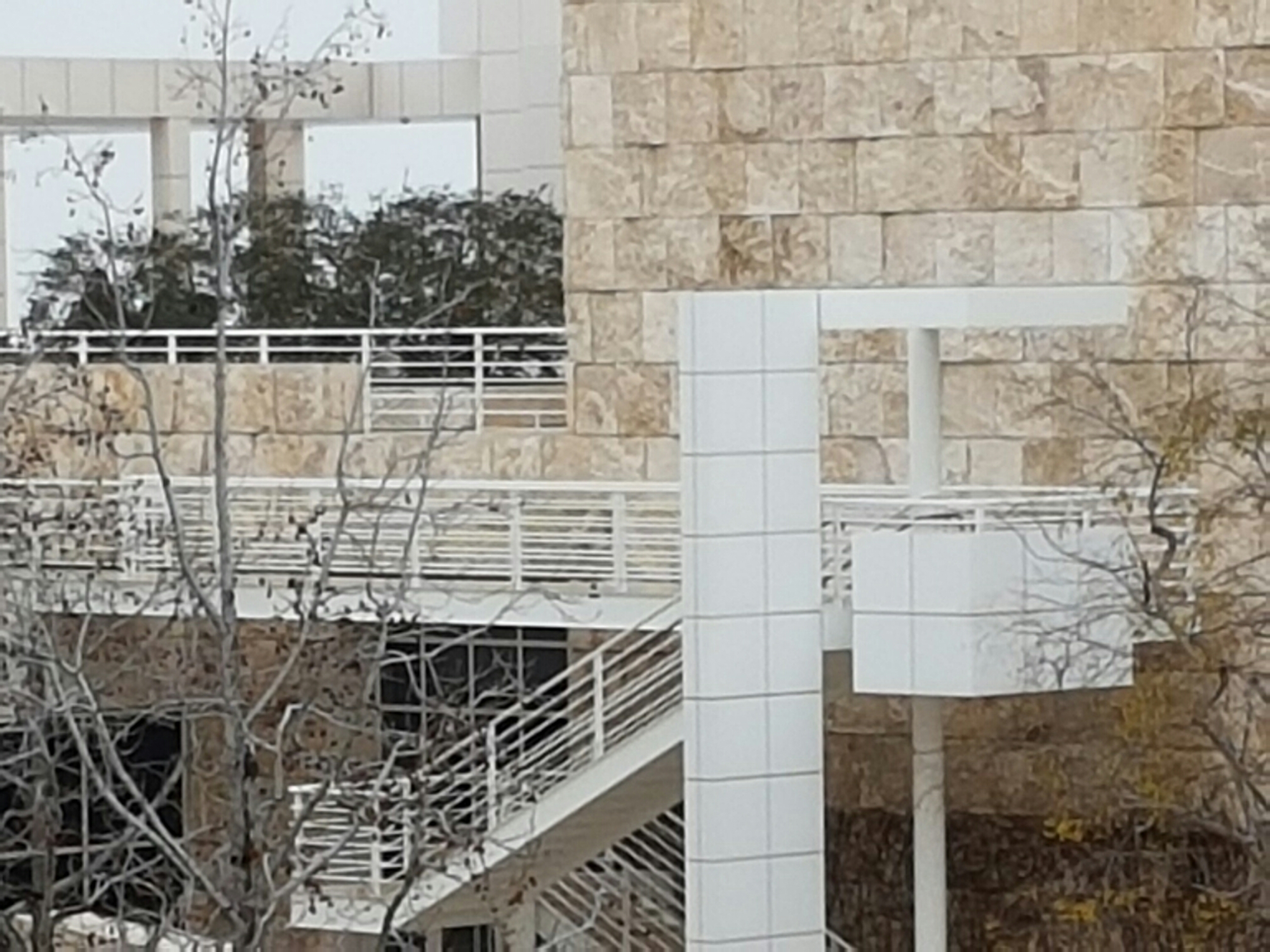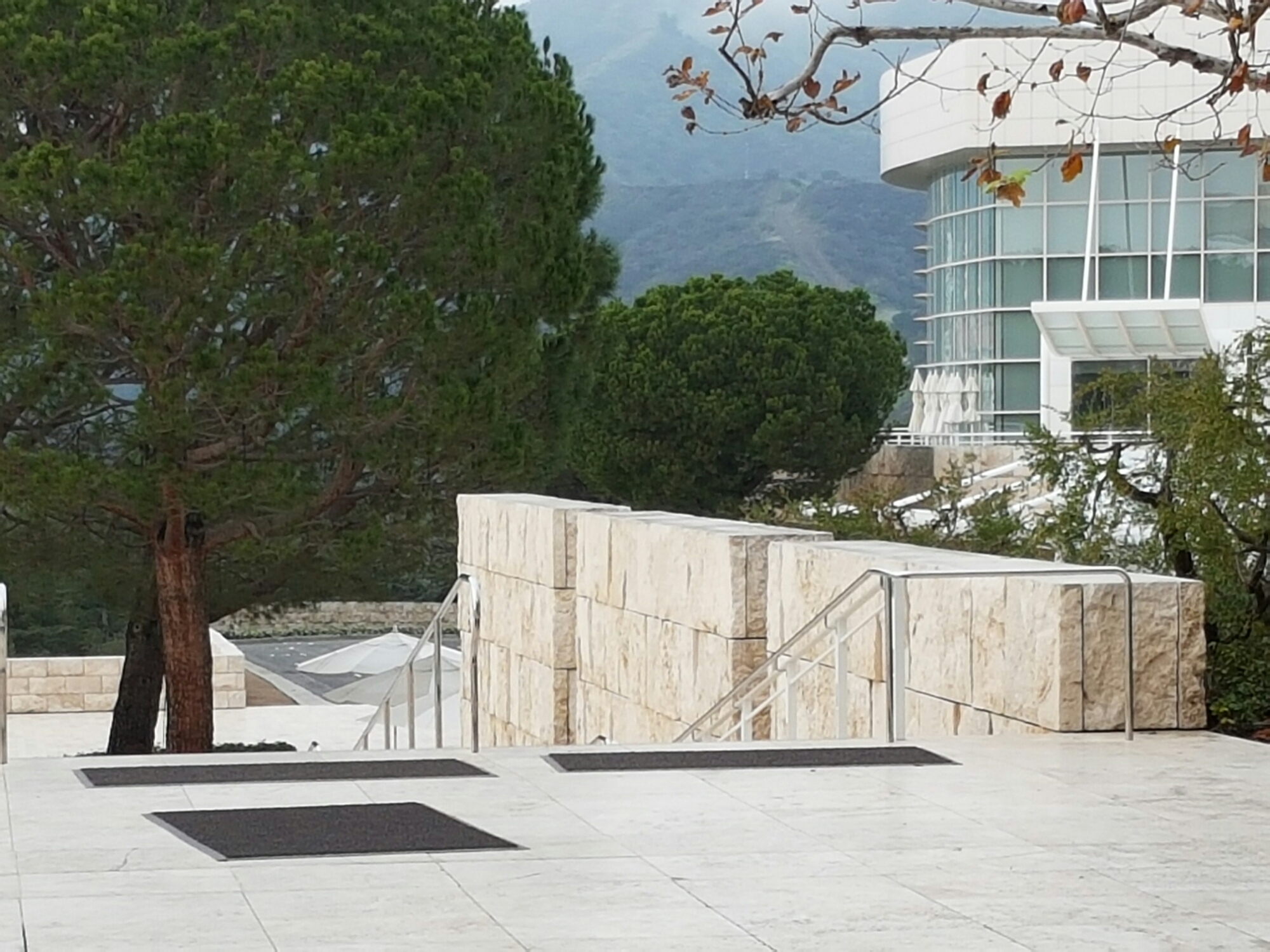 I only saw bits of the Getty yesterday in flitting from building to building in between meetings, so wasn’t really able to take in the complex geometry of Richard Meier’s hilltop city, its separate buildings mirroring the different functions of the institution, and the vistas everywhere of the valley below. Banham was on the nine-person committee which selected Meier as architect in October 1984 (Stirling was in the last three):-