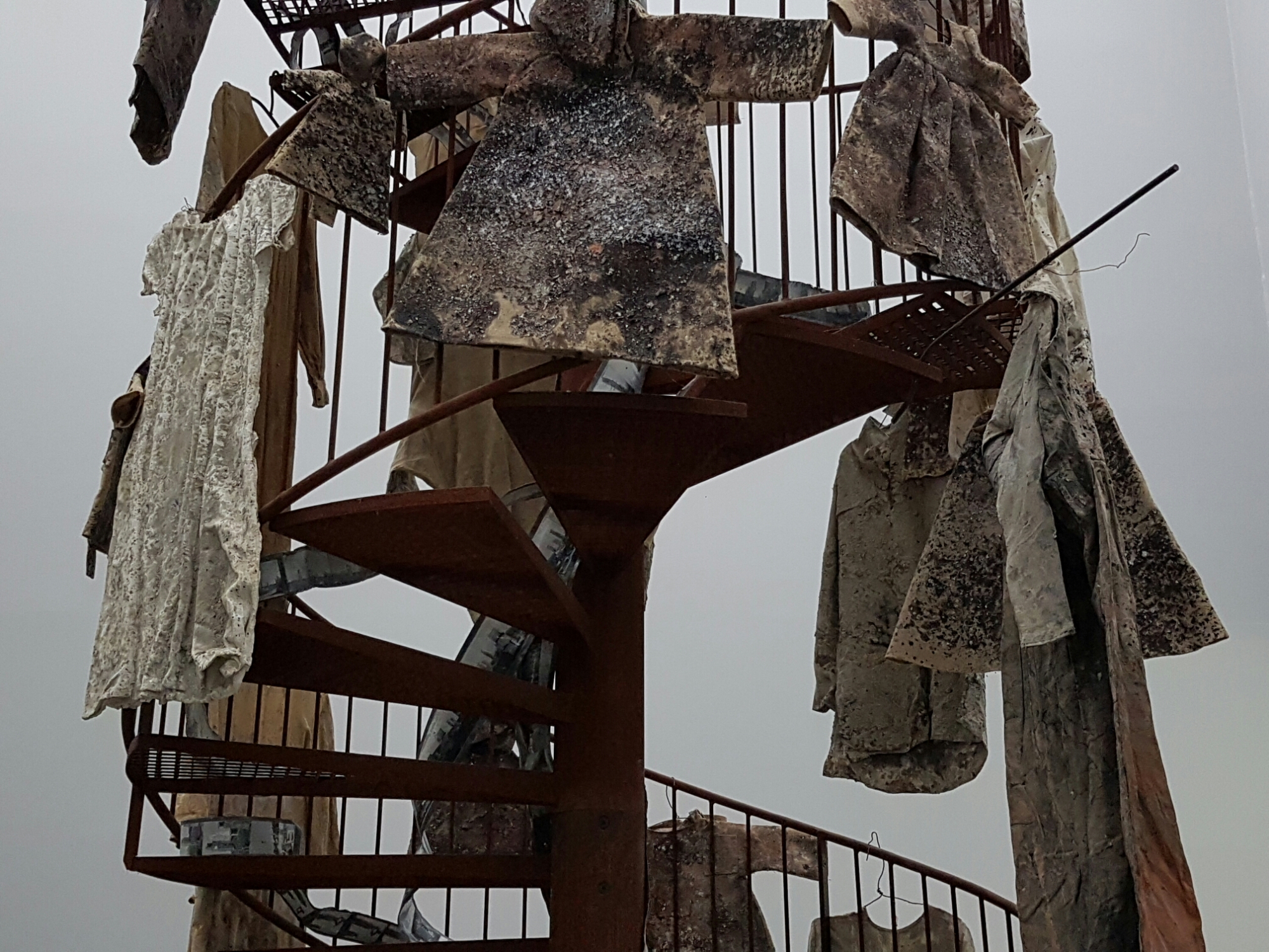 Off the aisle is a metal staircase festooned with plaster dresses:-